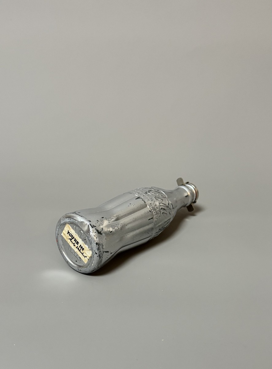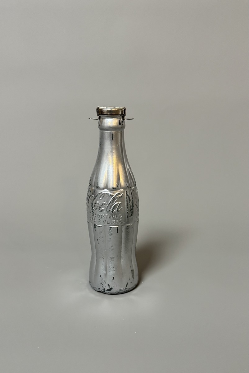 Silver spray paint on a Coca-Cola brand bottle. 'You're In, Andy Warhol' label under the base. Monogrammed cap.
