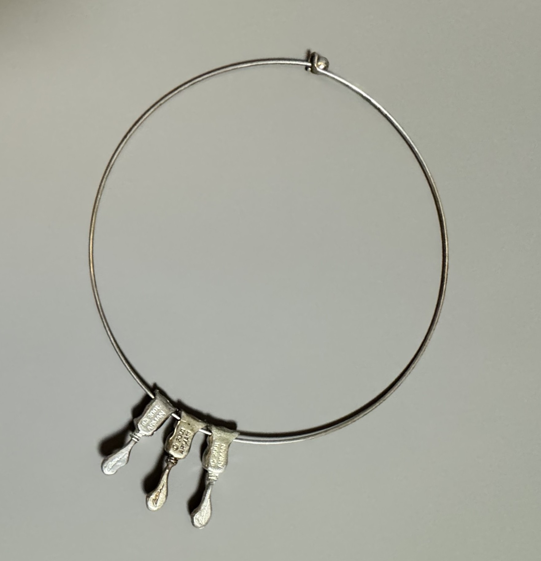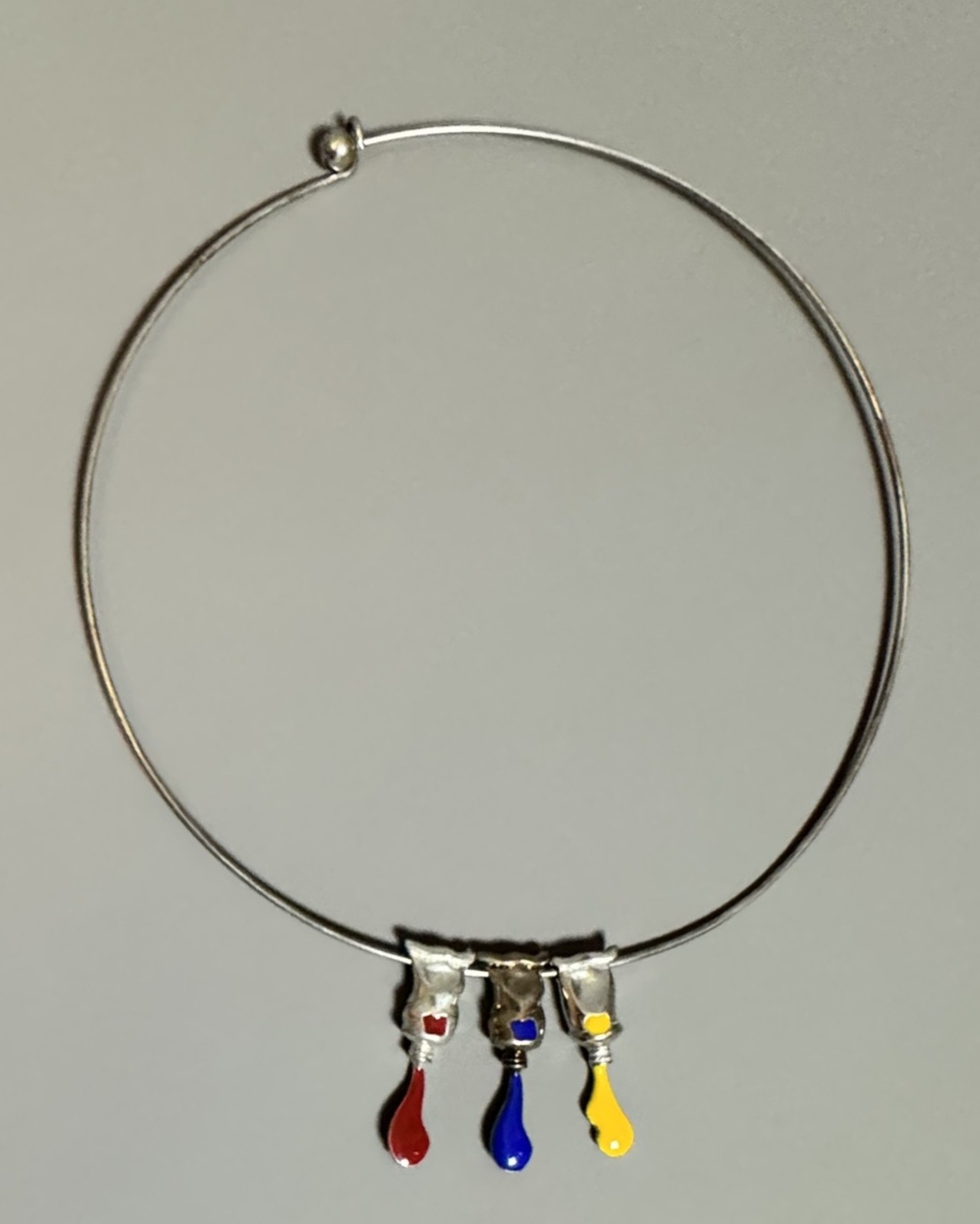 Necklace composed of three pendants in the shape of paint tubes, red, blue and yellow.