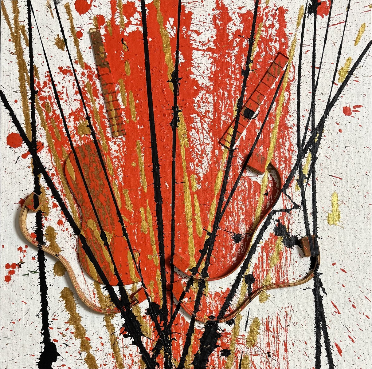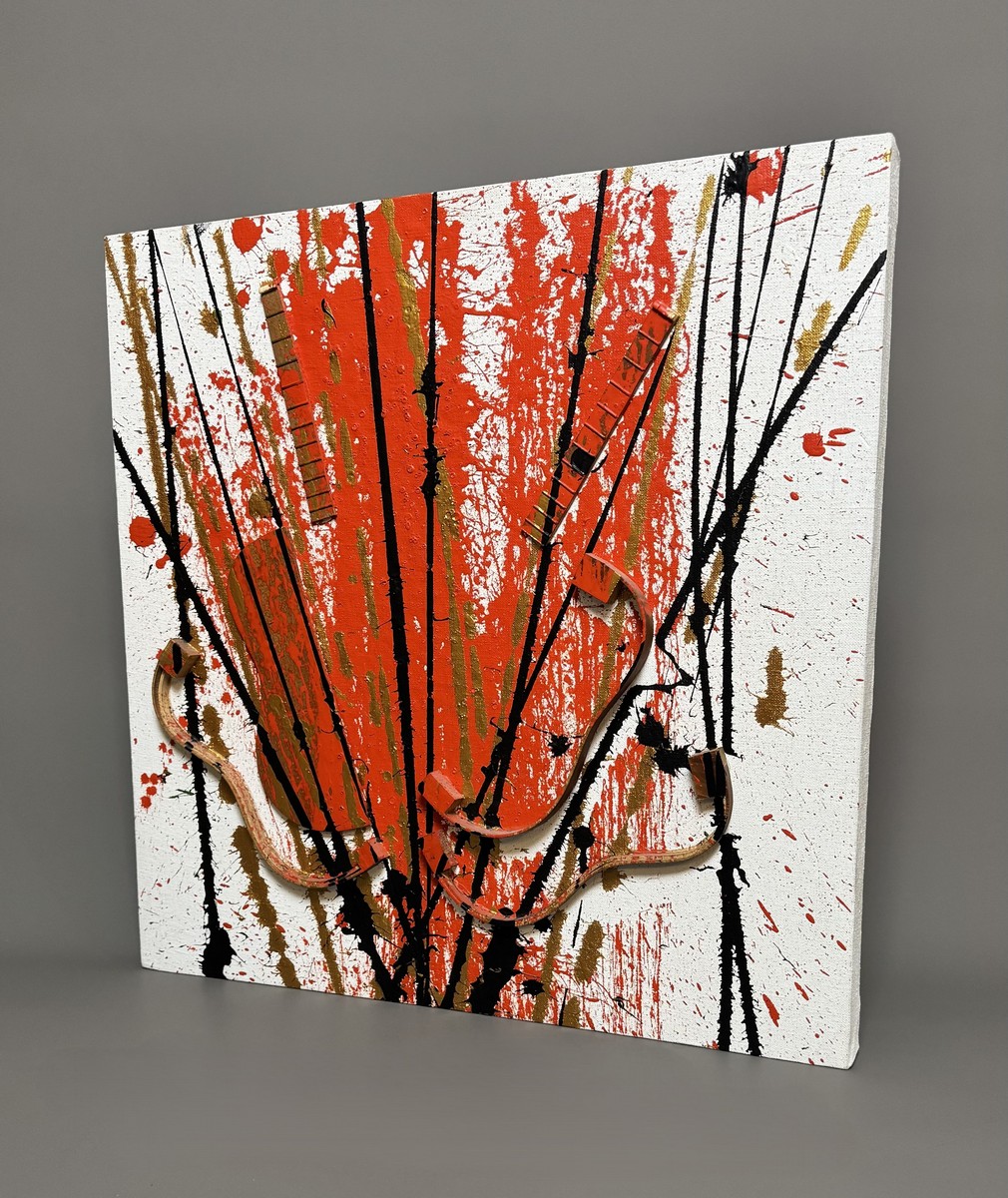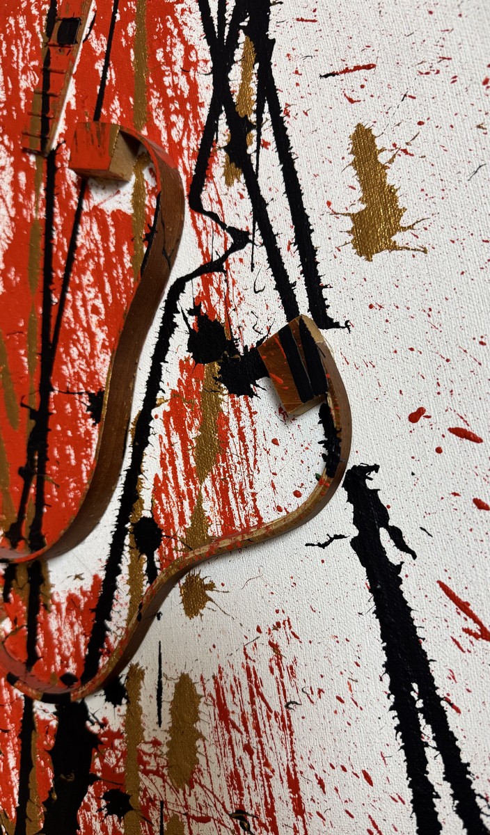 Cut-out ukulele and painting on canvas.