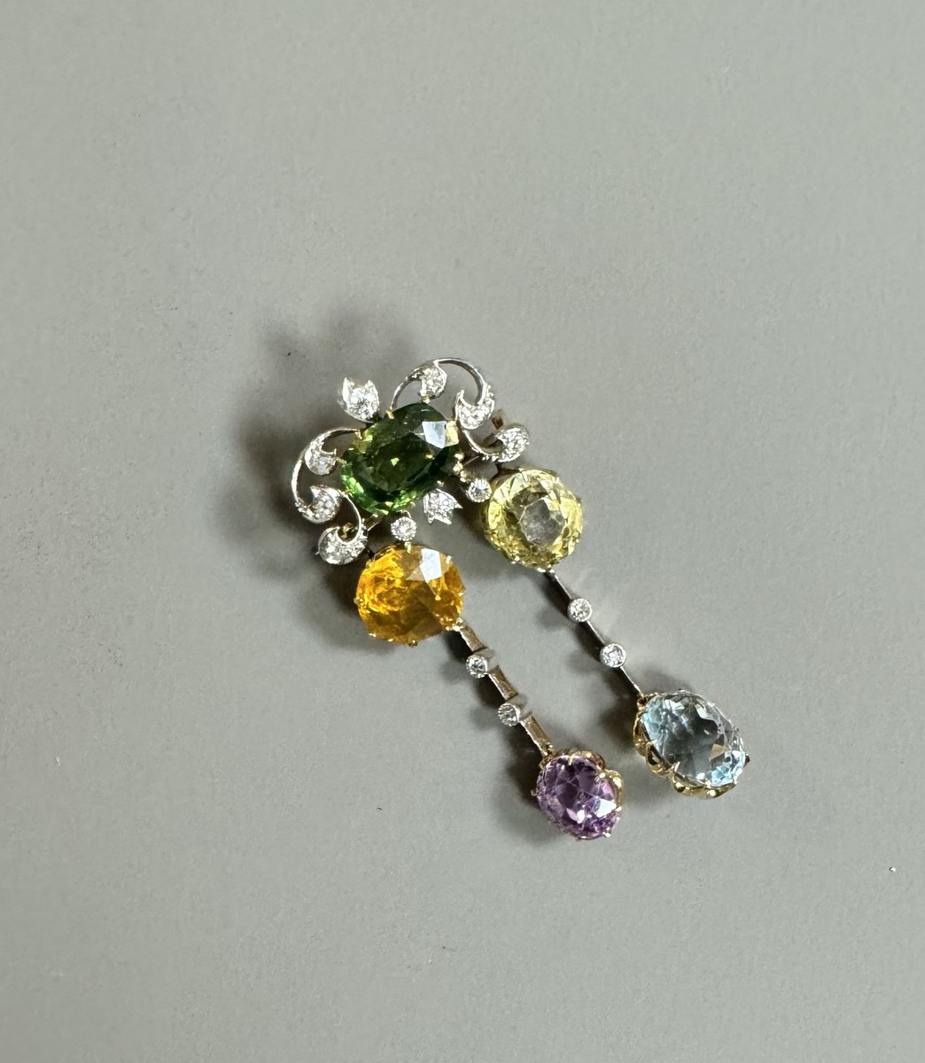 Batch 54 - Stylized 14K (585°/00) yellow gold brooch adorned with colored sapphires, a topaz, and diamonds. Can be worn as a pendant. Partly early 20th century. Gross weight: 11.4 g.