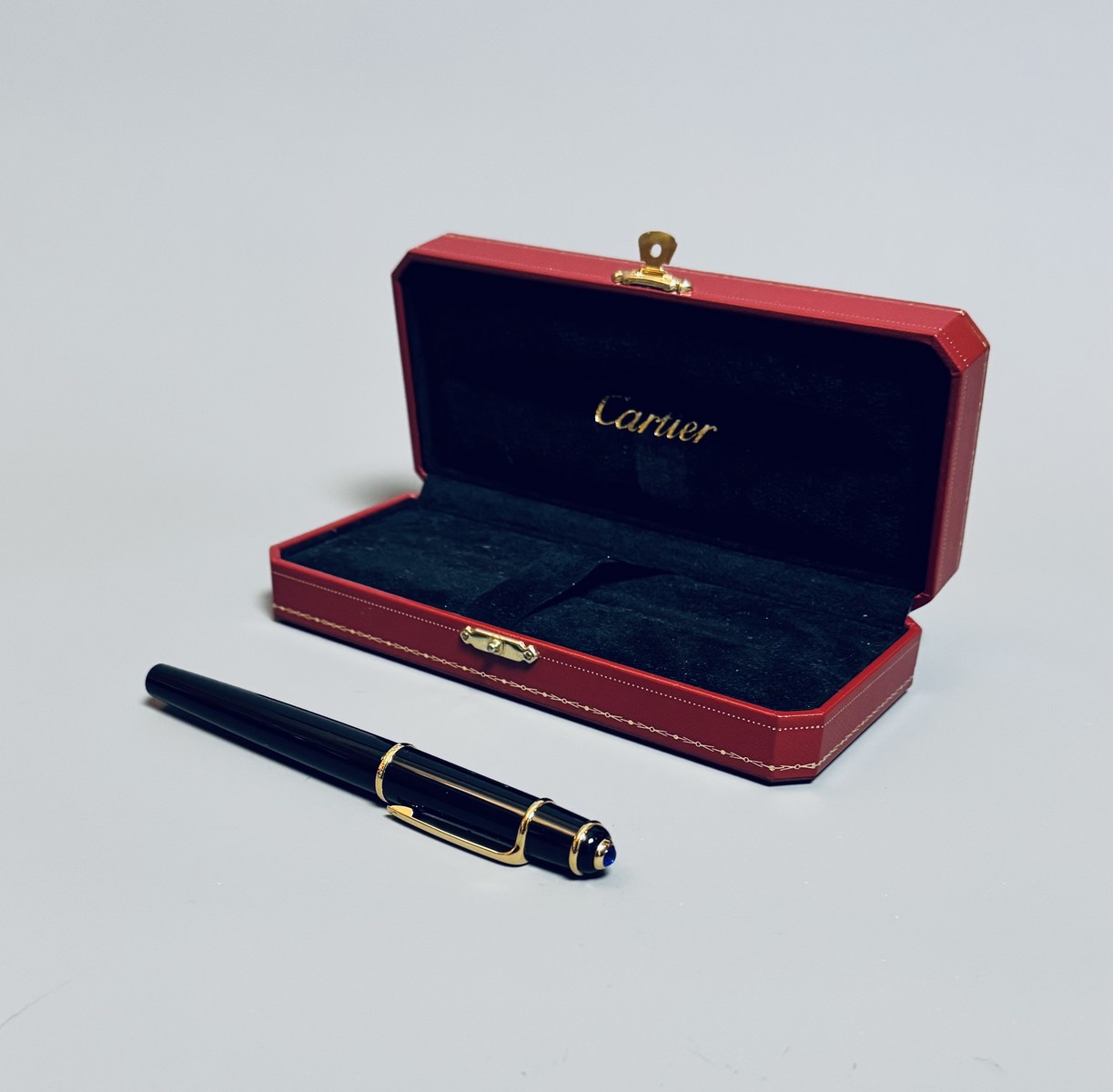 Lot 107 - CARTIER. Rollerball pen from the Diabolo collection, black resin, gold-plated trim. Sapphire cabochon at the top of the cap. Signed. In its original box. Gross weight: 39 gr.