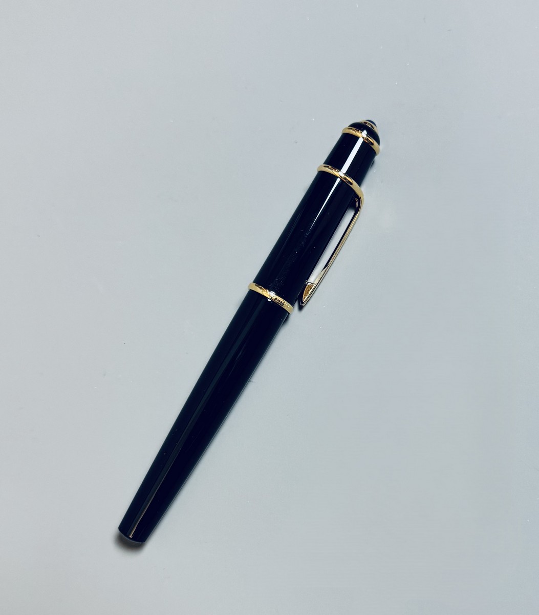 Rollerball pen from the Diabolo collection, black resin, gold-plated trim. Sapphire cabochon at the top of the cap. Signed. In its original box. Gross weight: 39 gr.