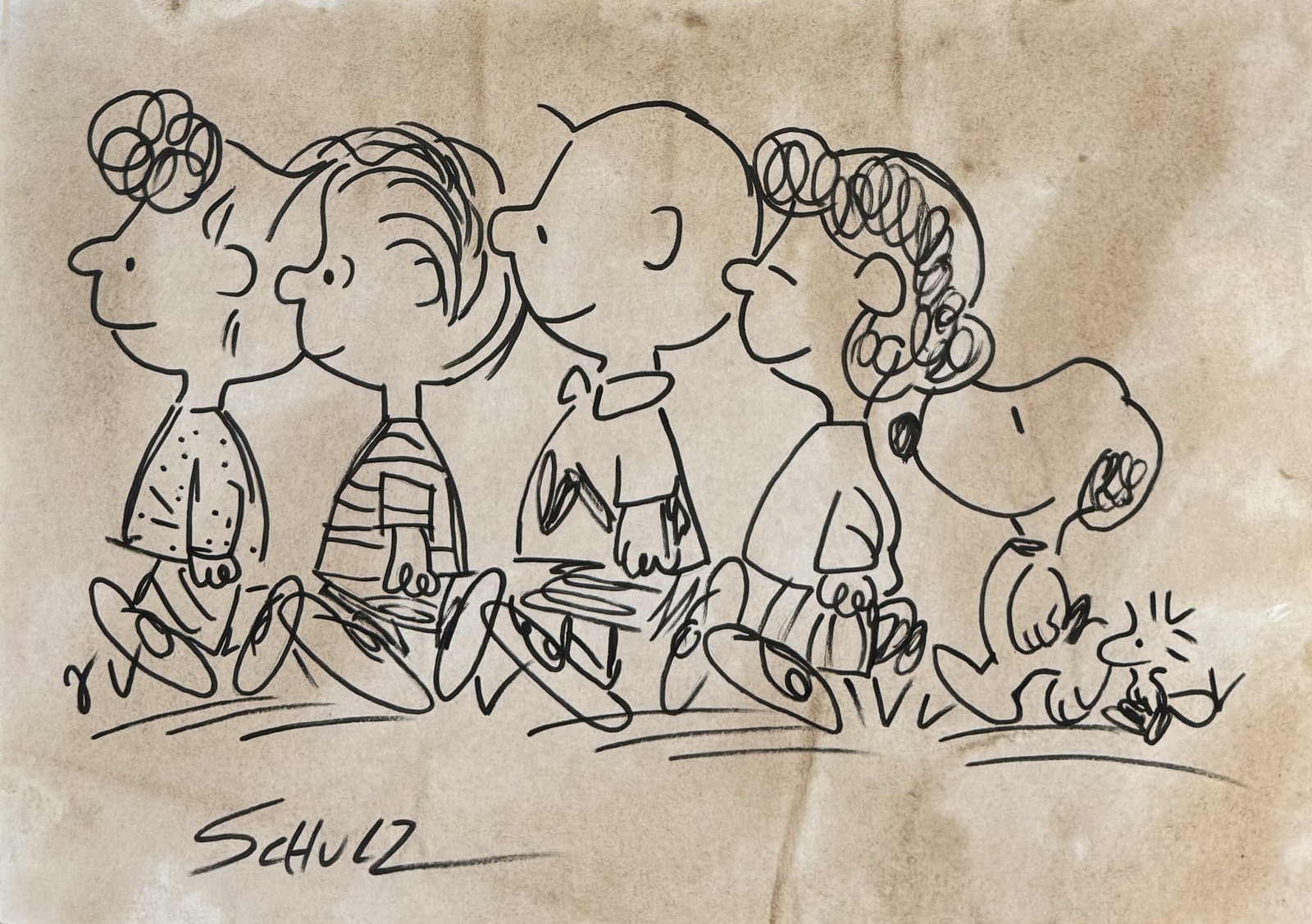 Black marker drawing on paper. Signed lower left. Stamped "Charles Schultz" on the back.