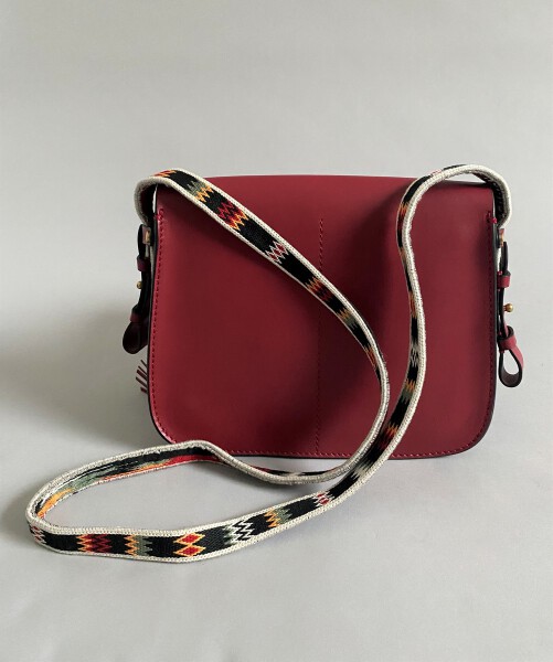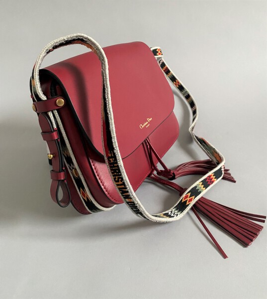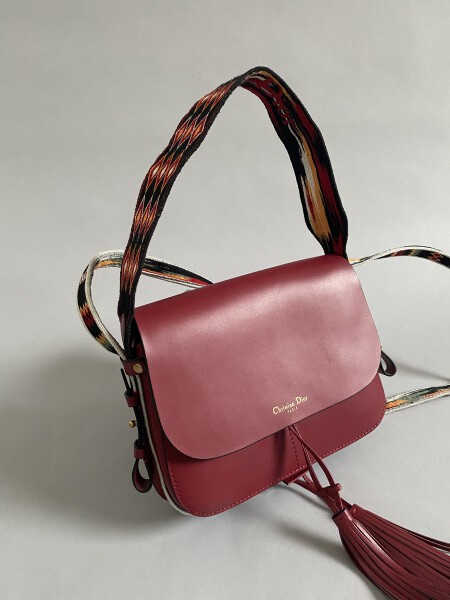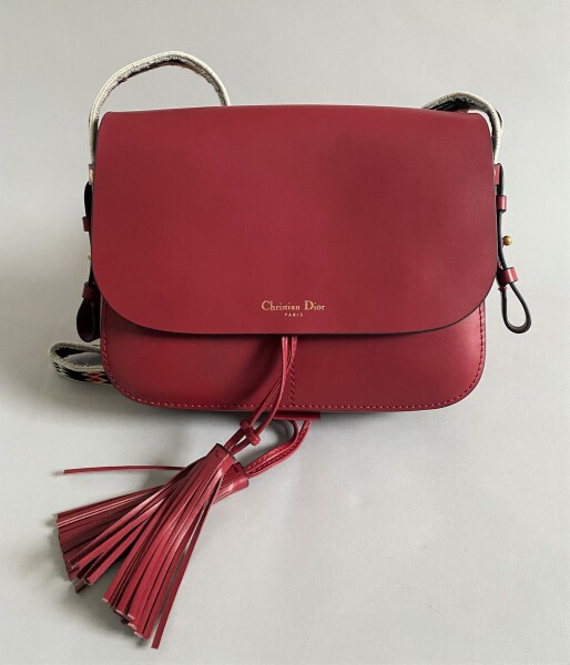 Red leather bag, double fabric strap. Dust bag. Sign. New condition.