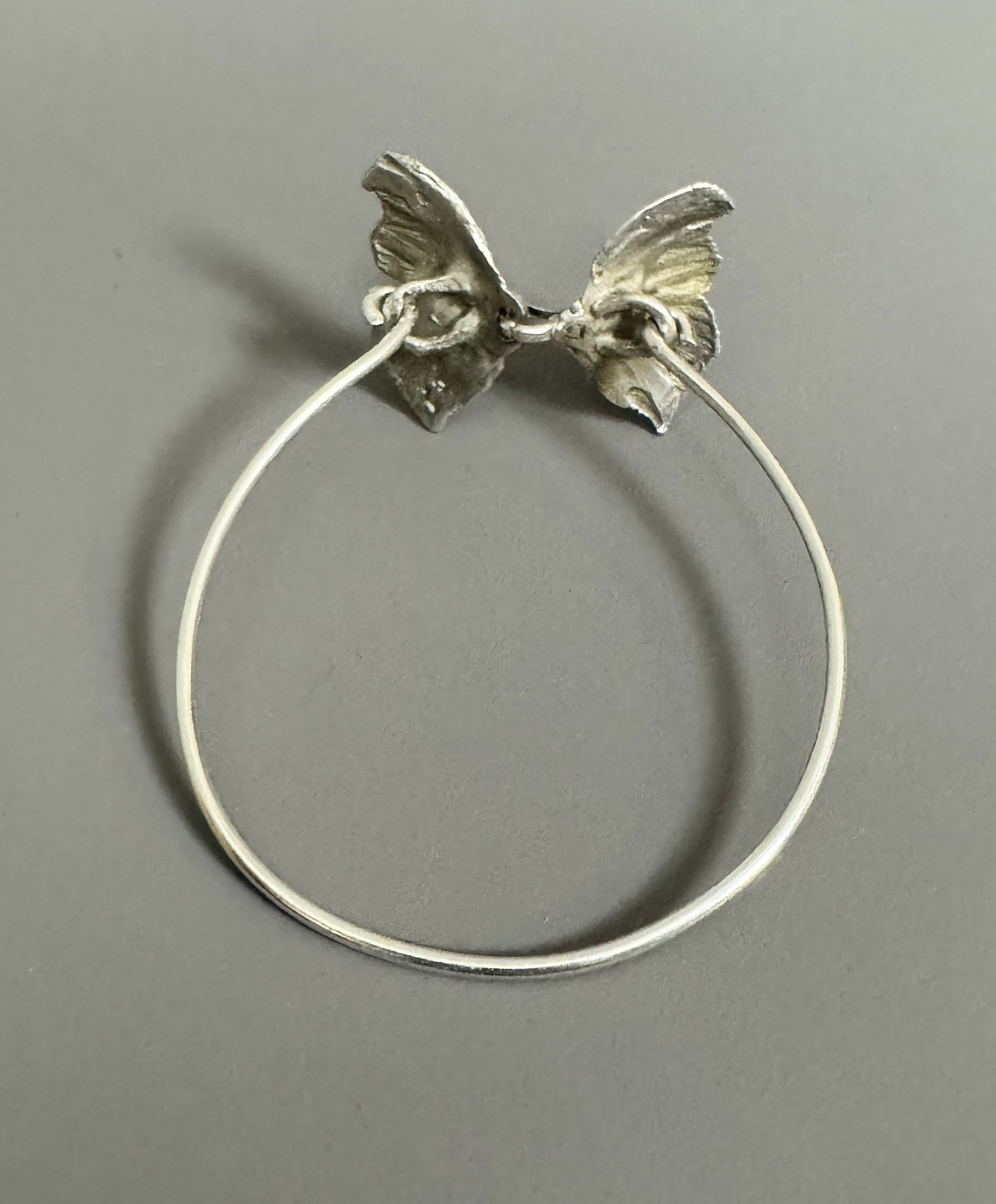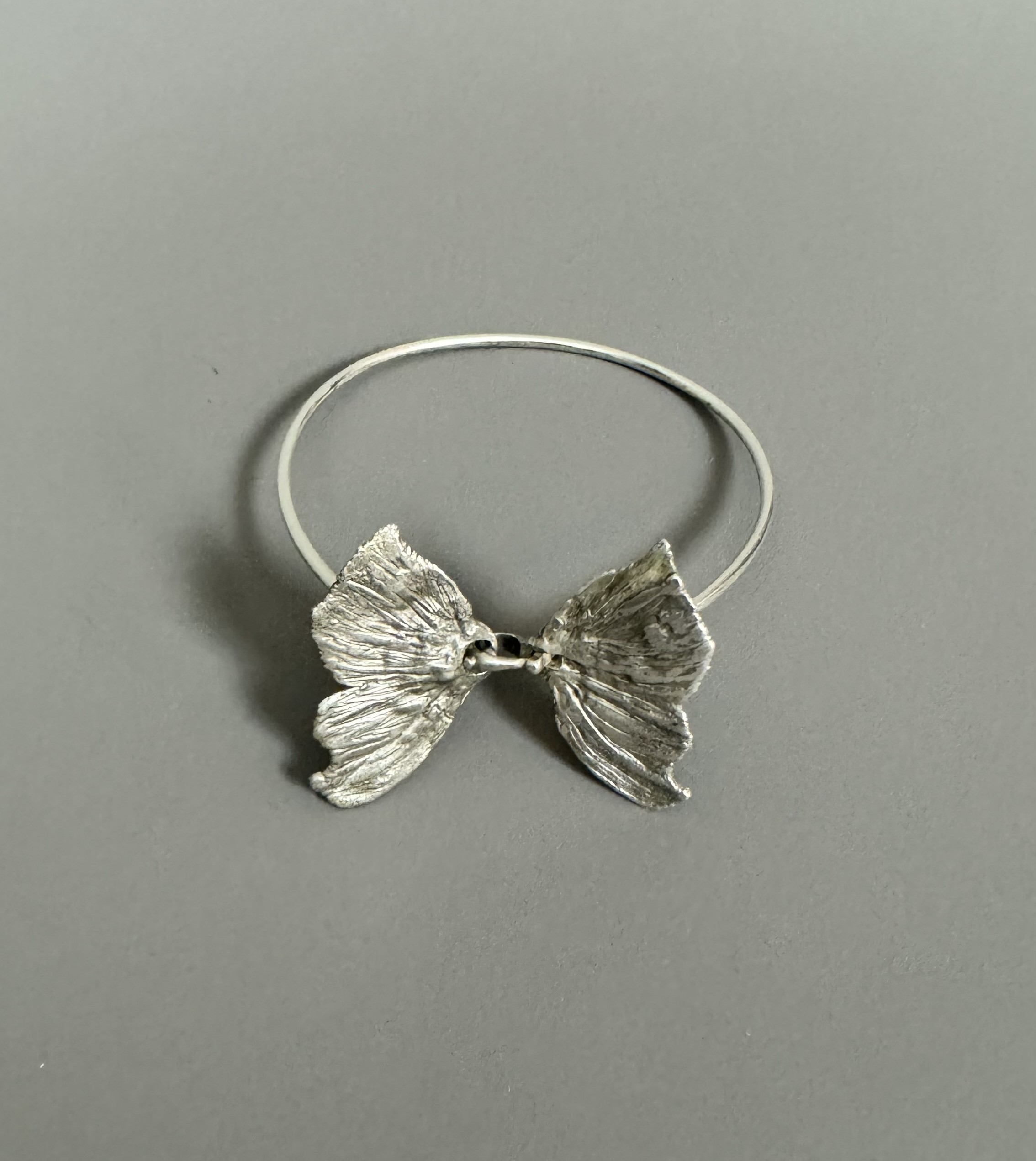 Silver butterfly motif bangle bracelet with front hook clasp opening.