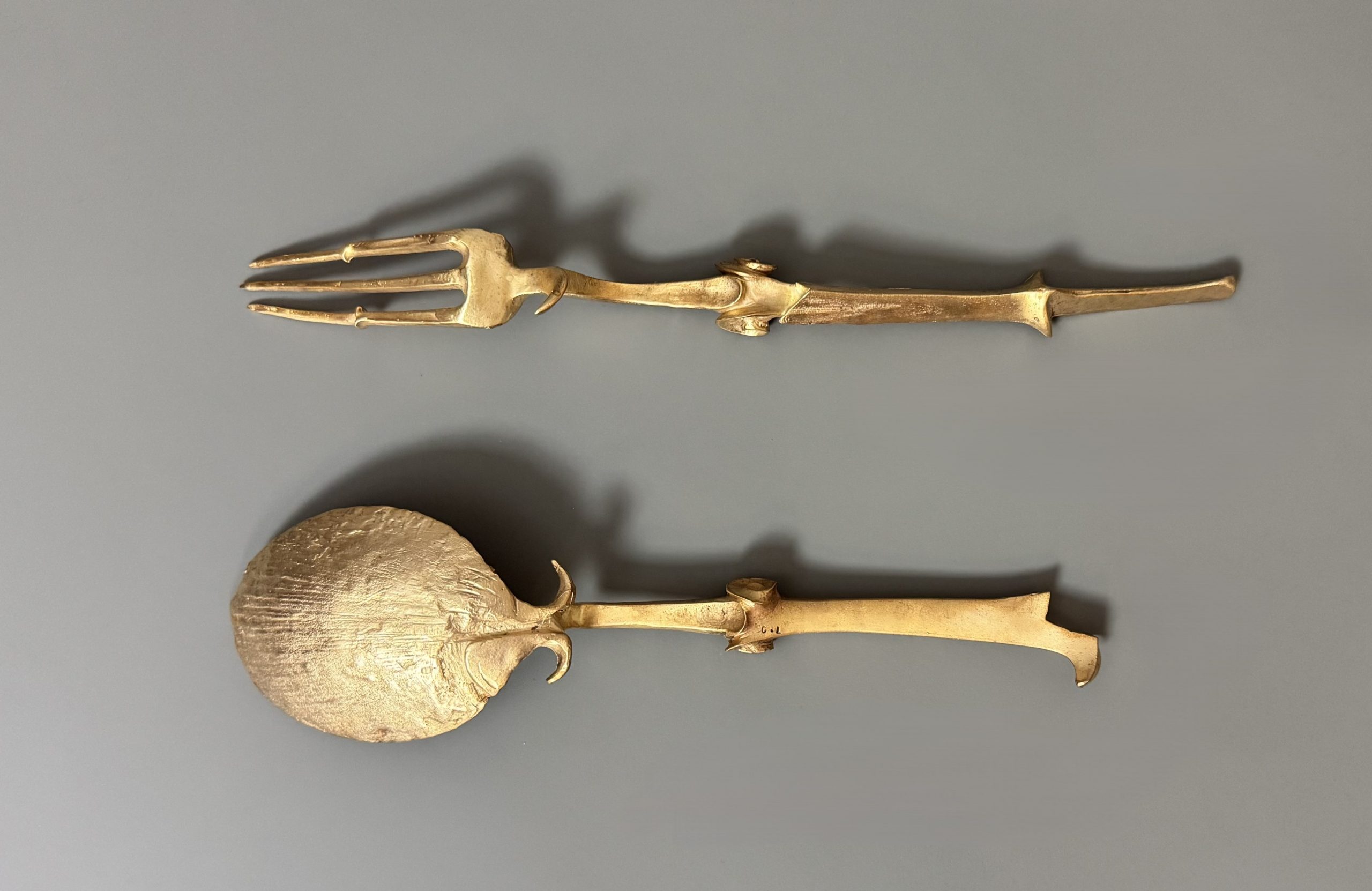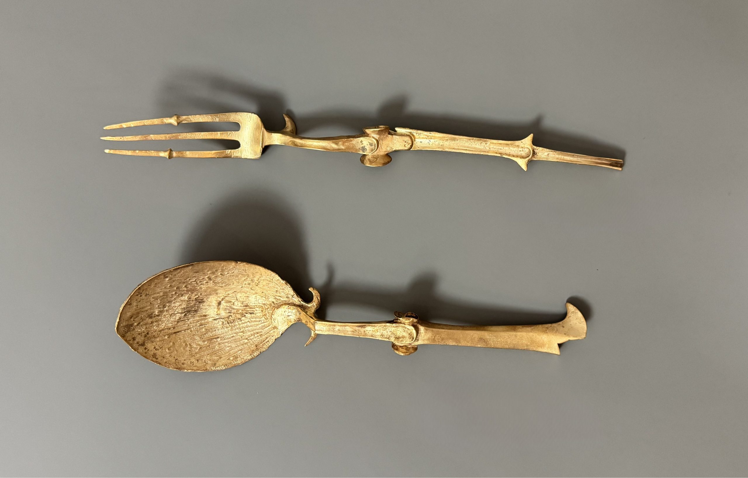 Pair of large cutlery, a fork and a table spoon, in bronze.