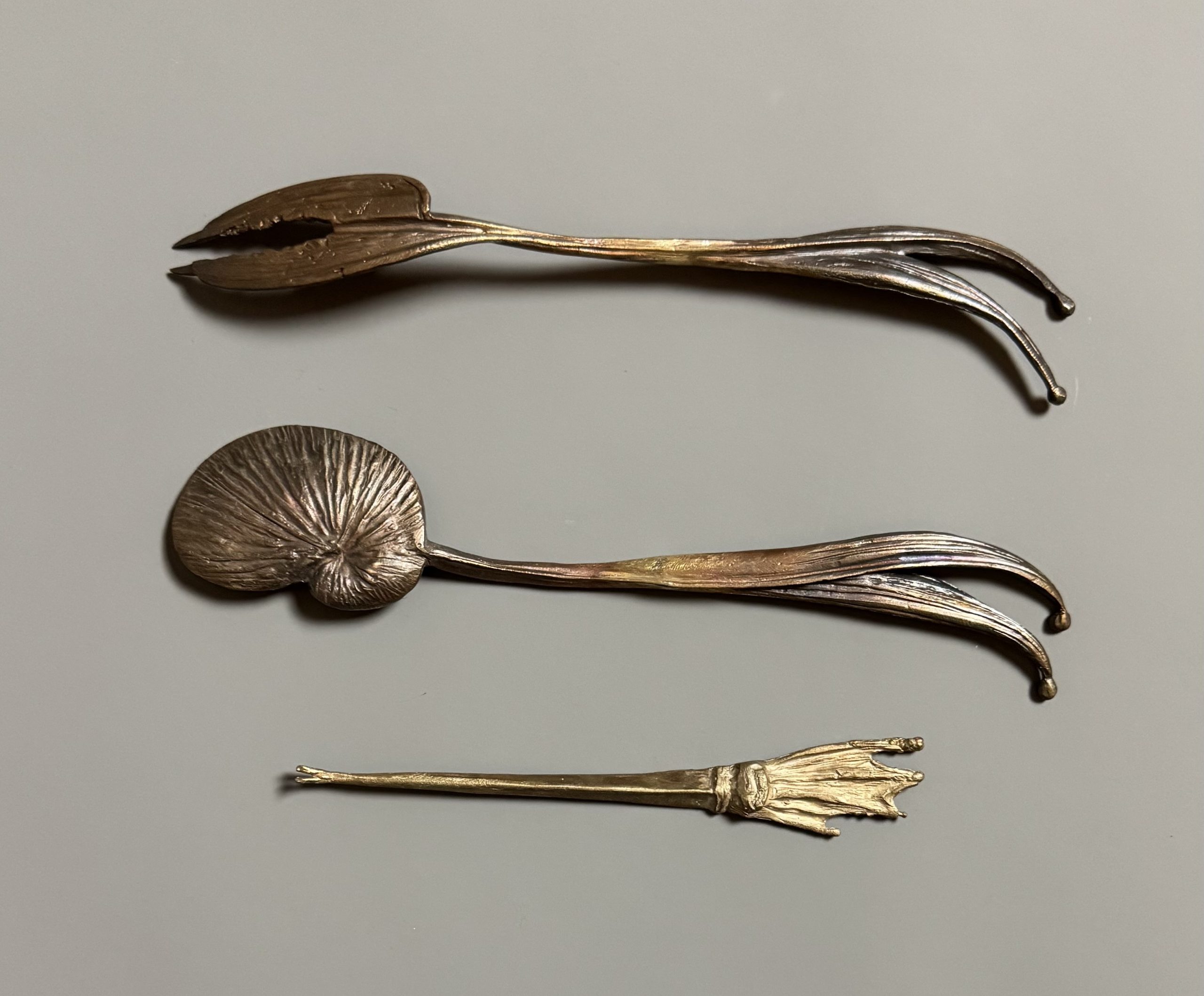 Set of three bronze seafood cutlery pieces including; a lobster claw fork, a spoon and a shellfish scoop.