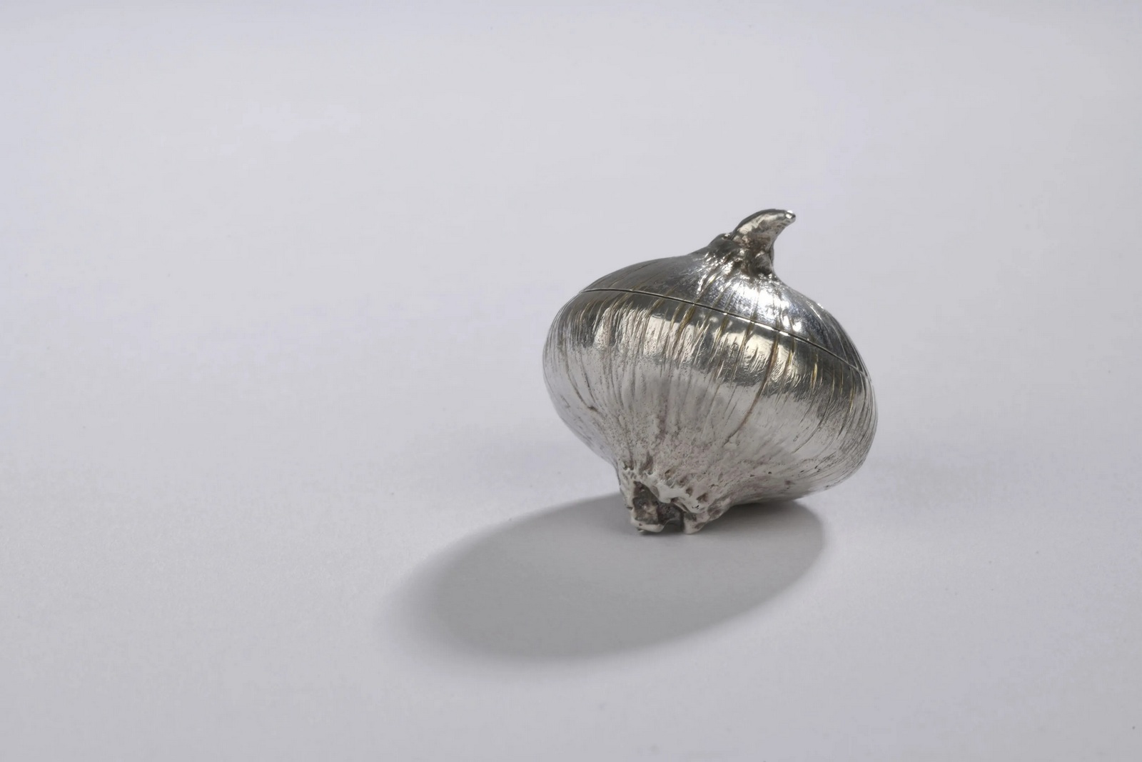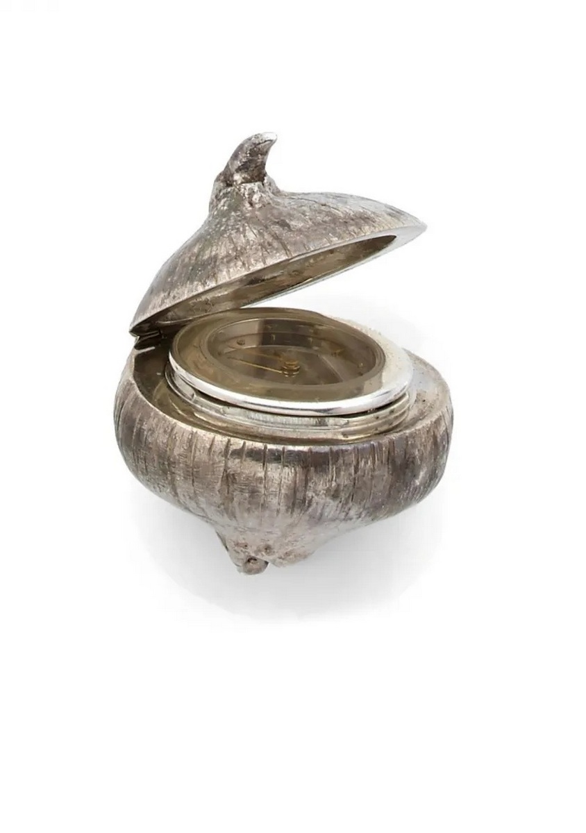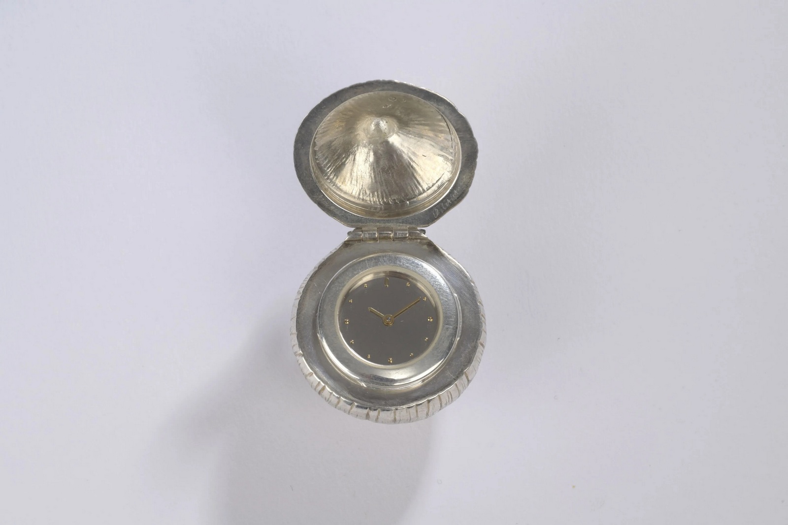 Rare watch sculpture representing an onion in natural silver. Inside, a watch with a round case, a silver-backed dial and gold hands.