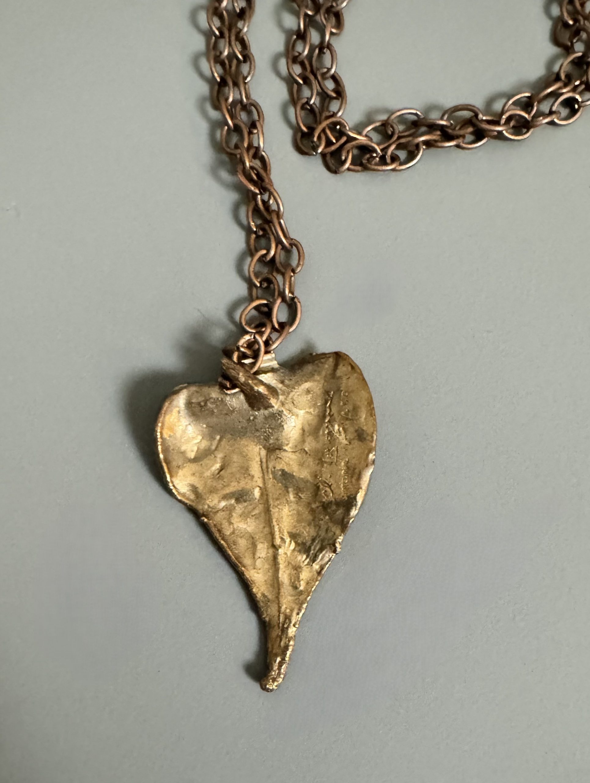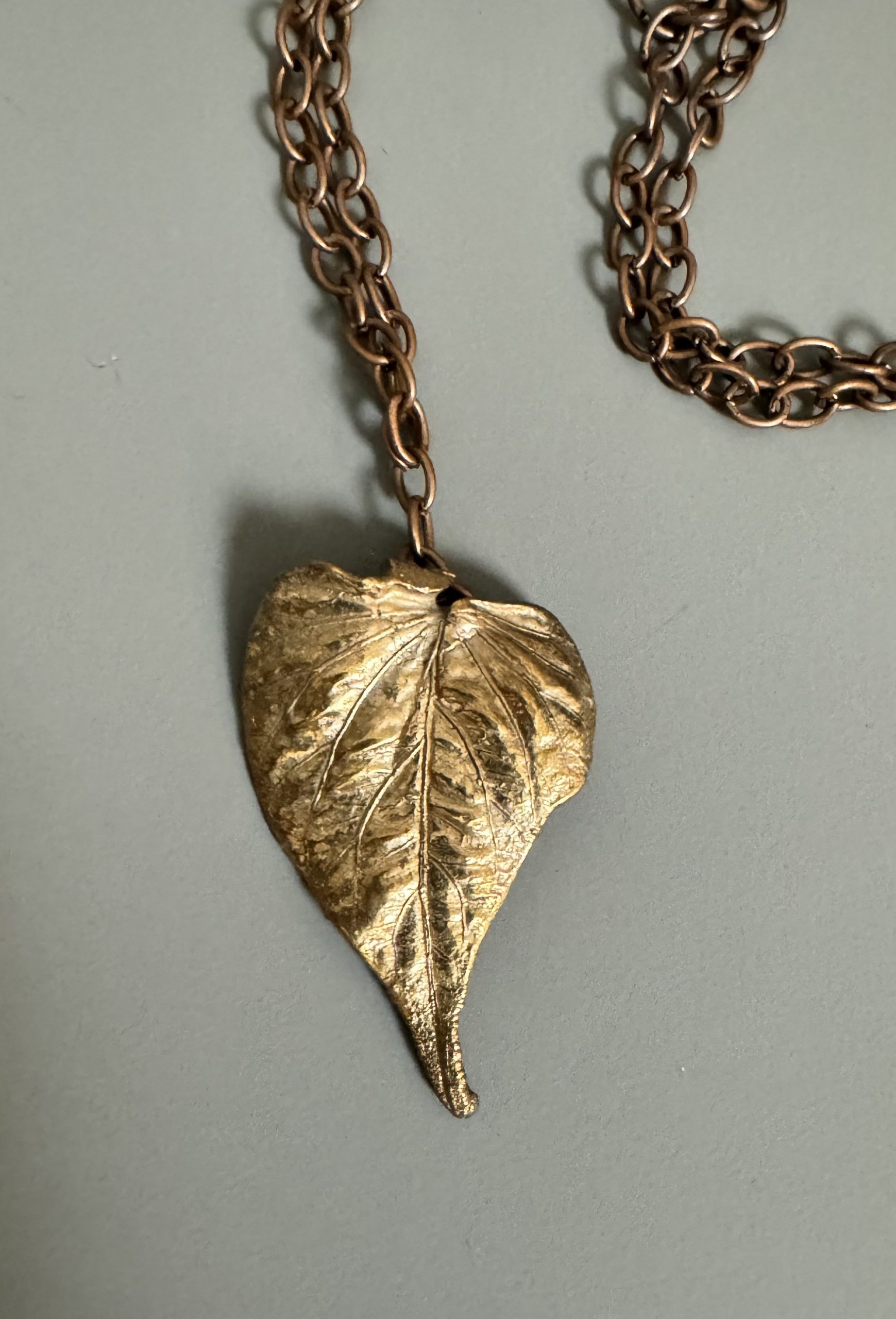Bronze pendant with a golden patina on a link necklace.