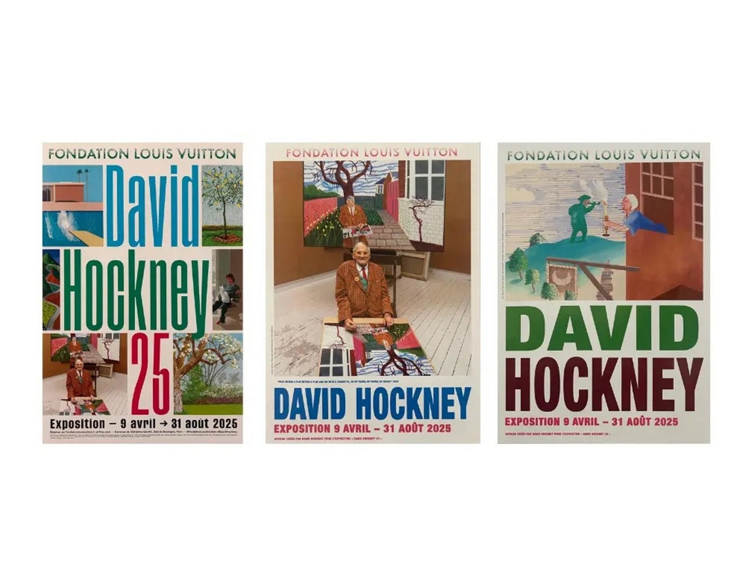 Set of three posters for the David Hockney Exhibition at the Fondation Vuitton, from April 9 to August 31, 2025, Paris. Limited edition.