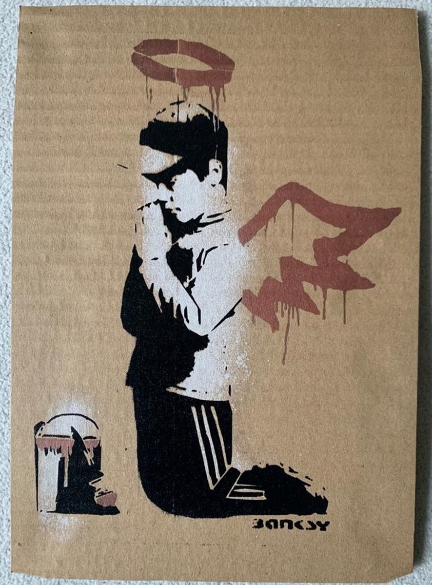 Free stencil spray paint art sown at Banksy's theme park "Dismaland" which ran for two months, from August to September 2015. During the exhibition period, Dismaland held a Free Art where they hid the artwork in various locations and you could take it home with you. (Some damage to the cardboard is the cause.) Comes with original entrance ticket and Dismaland Map.