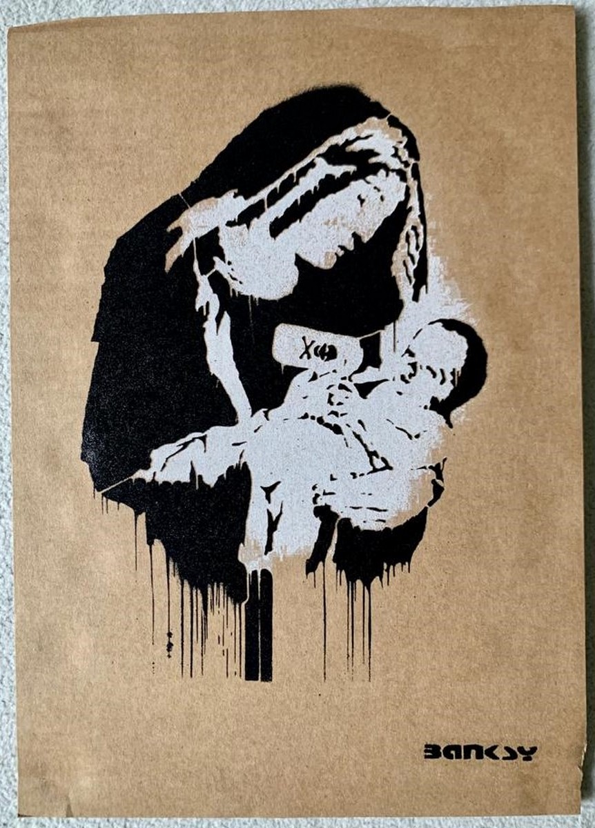 Free stencil spray paint art sown at Banksy's theme park "Dismaland" which ran for two months, from August to September 2015. During the exhibition period, Dismaland held a Free Art where they hid the artwork in various locations and you could take it home with you. (Some damage to the cardboard is the cause.) Comes with original entrance ticket and Dismaland Map.