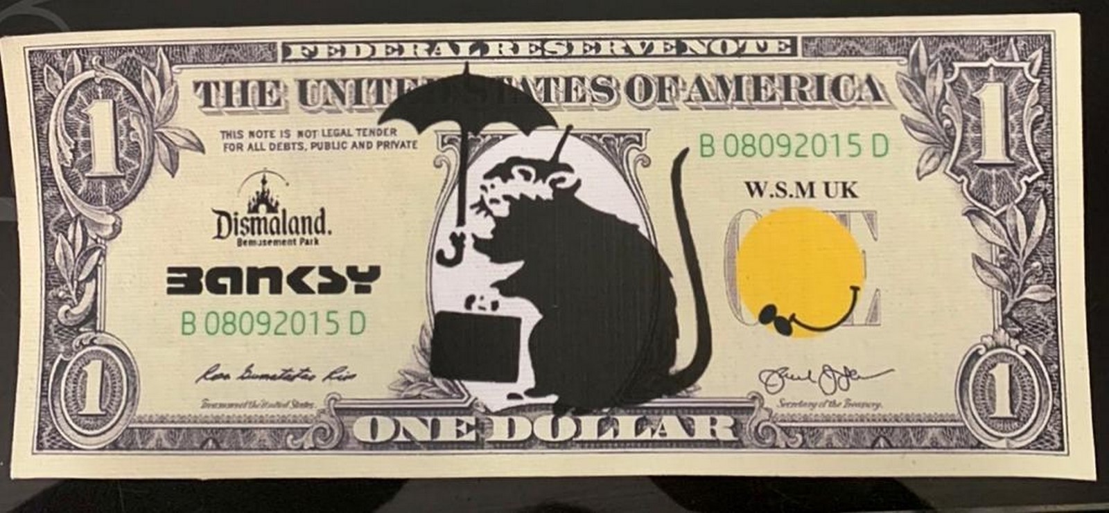 Certificate on the back of the work mentioning "This is to certify that the work described above is an original work of art by Dismal Mouse, Acquired during Dismaland, Banksy's event at Weston Super Mare in August-September 2015.