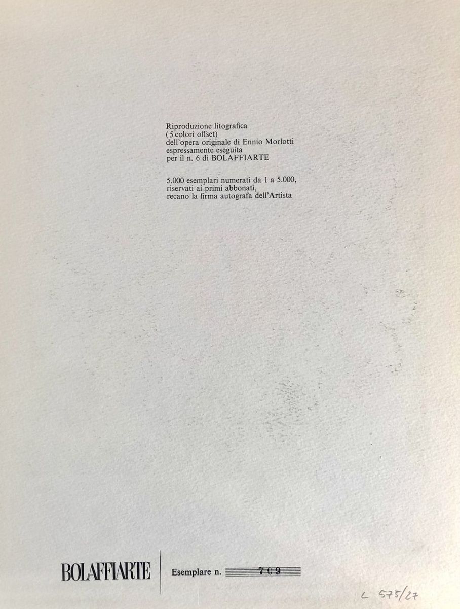 Photolithography on paper, signed in pencil and numbered 709/5000, publisher's blind stamp. Publisher: BolaffiArte, Italy, 1971. Edition proof is printed on the back. Good condition, 30 x 23.5 cm