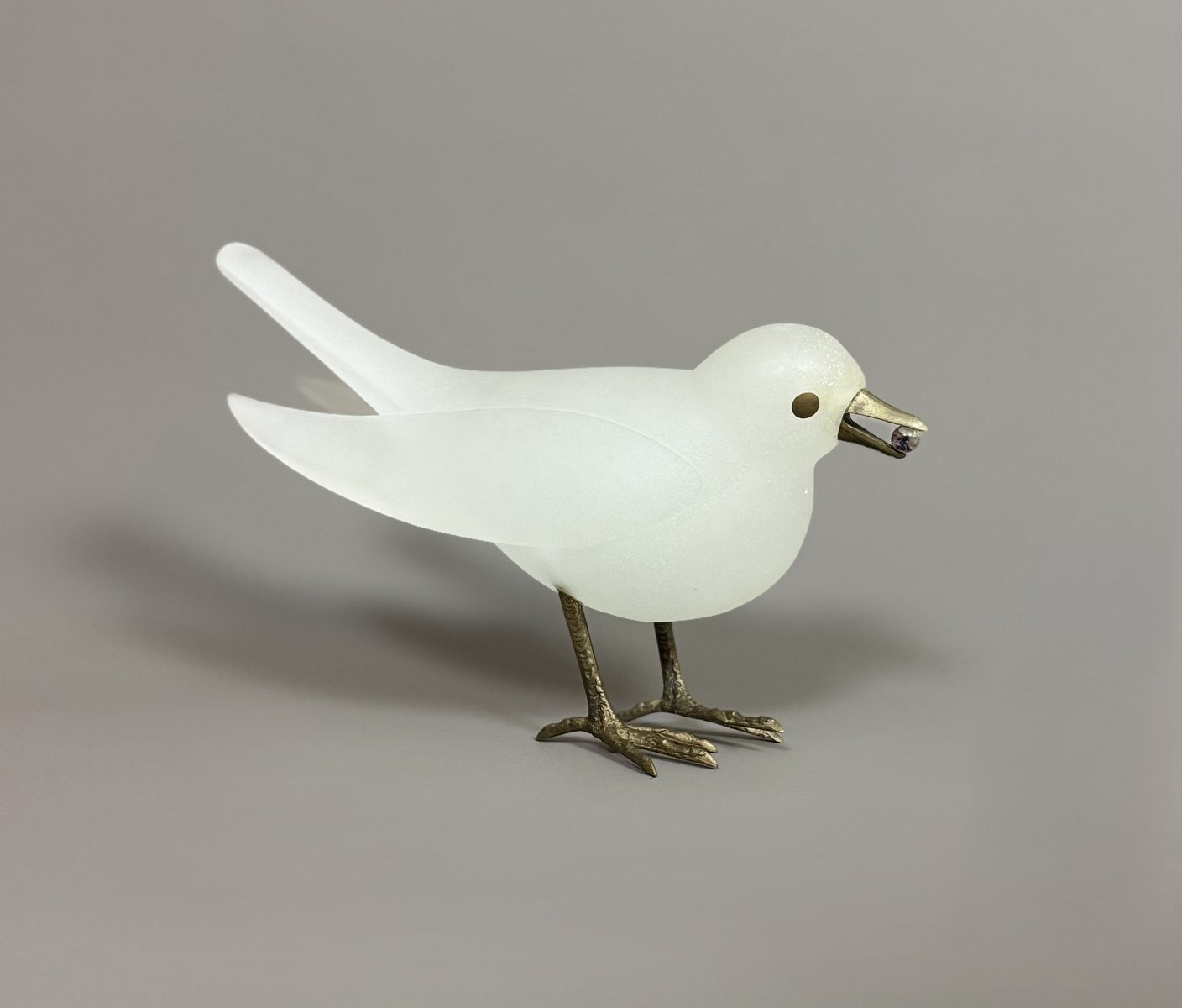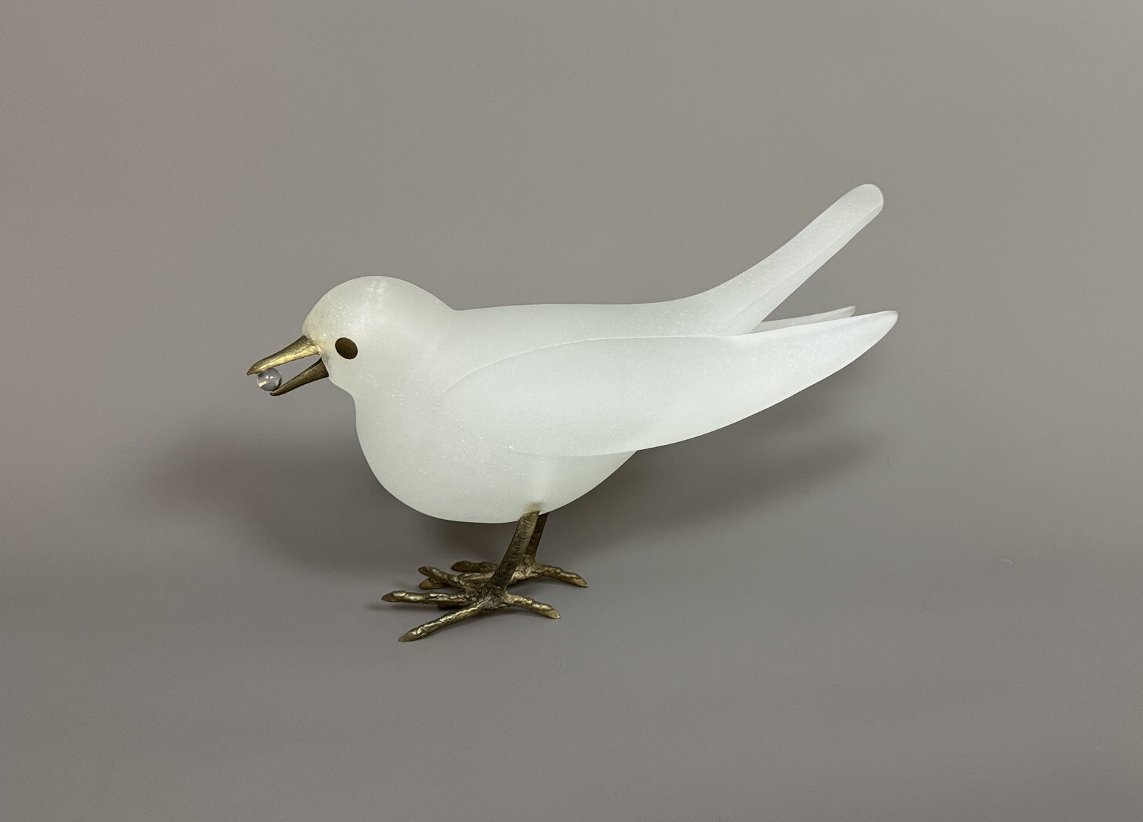 Sculpture in white glass paste, eyes, beak and feet in bronze with a golden patina. Original crystal bead. Signed and numbered 251/300.