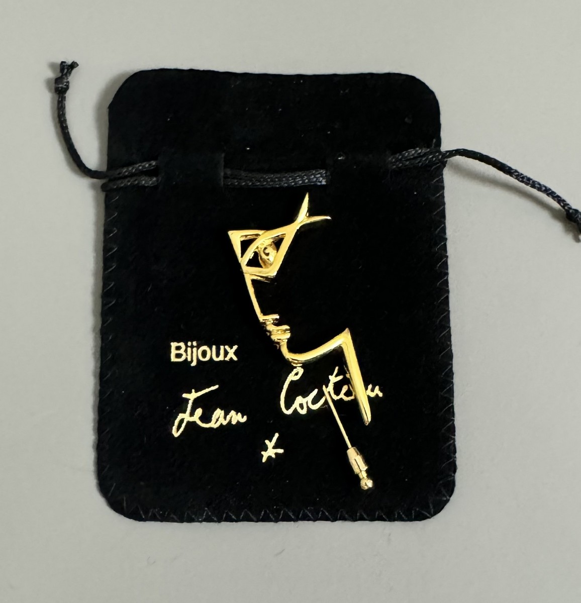 Gold-plated metal pin depicting a profile and black enamel. Signed "Jean Cocteau" on the edge. Dimensions: approximately 7.1 x 2.6 cm.