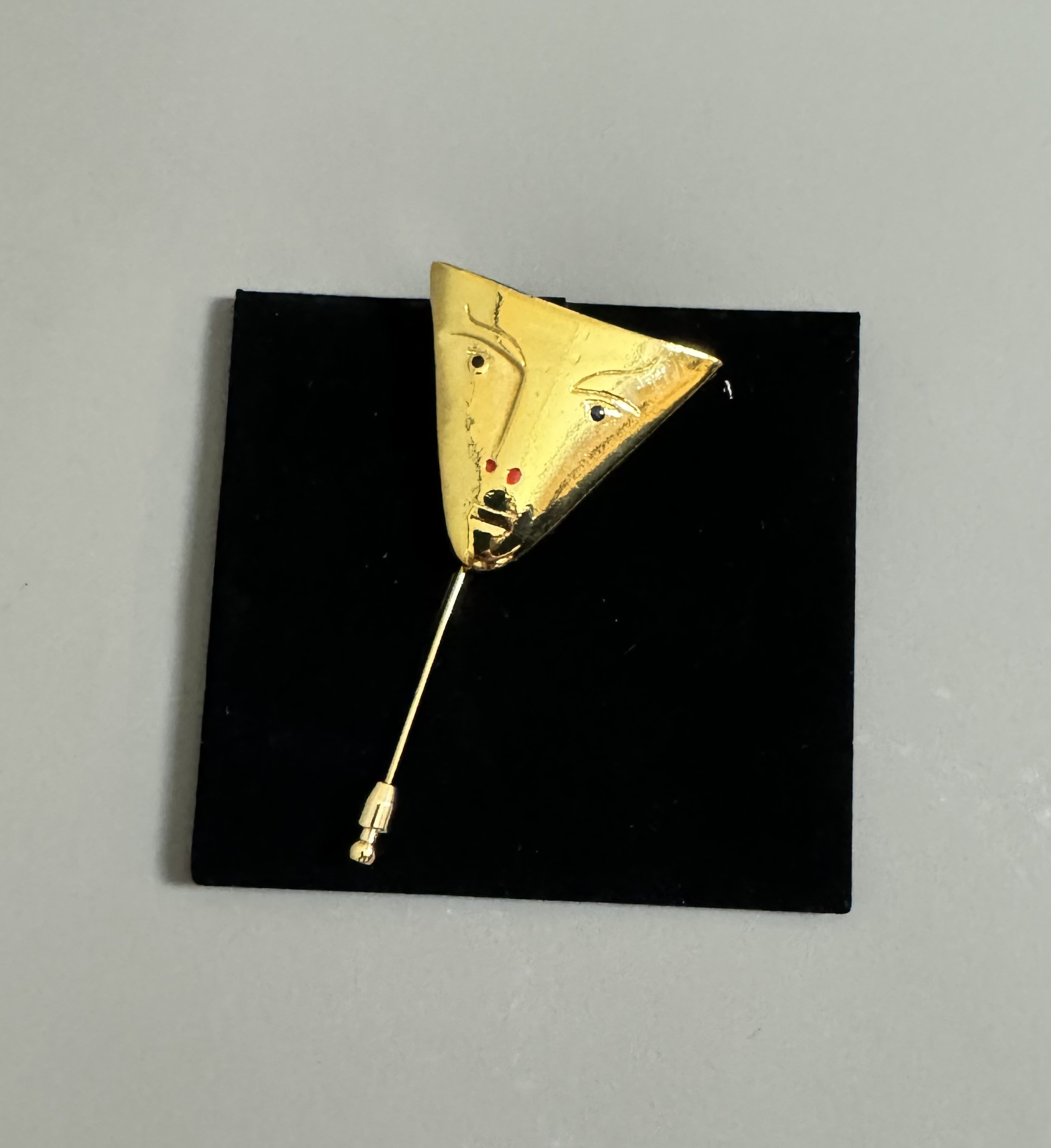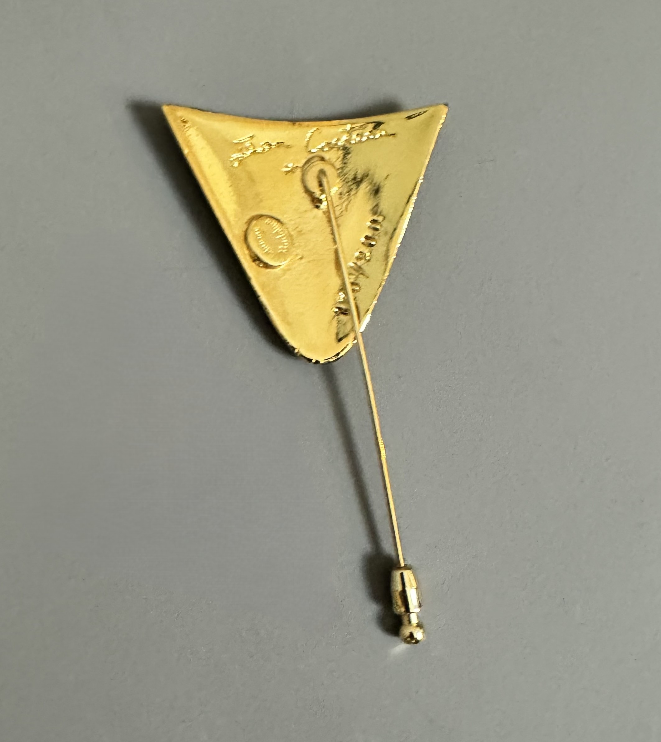 Gilt bronze pin with black and red enamel. Signed "Jean Cocteau" on the back. Numbered 169/200.