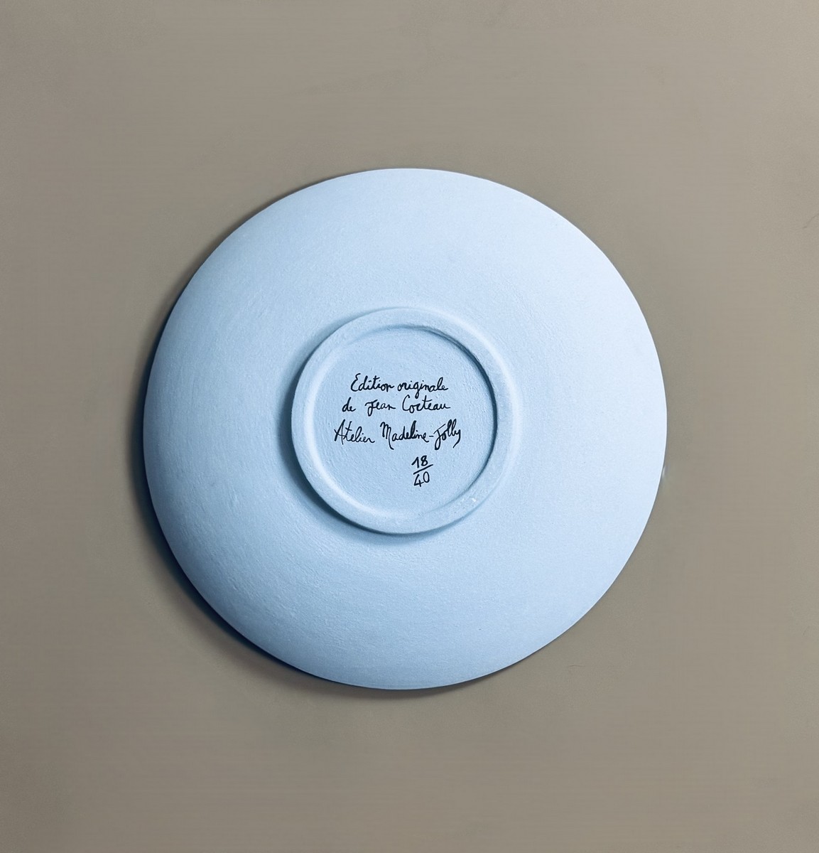 Histoire : Jean Cocteau, en pleine collaboration avec la potière Marie-Madeleine Jolly, lui demanda un jour avec son aplomb habituel : « Je voudrais un plat en terre bleu. » Surprise, elle lui répondit qu’une terre bleue n’existait tout simplement pas, on travaille la terre blanche et rose, mais certainement pas bleue. Cocteau, fidèle à son imagination sans limites, répliqua alors : « Eh bien, débrouillez-vous pour que le plat soit bleu. » Touchée par le défi et amusée par l’exigence poétique de l’artiste, Madame Jolly décida de créer l’impossible. Elle recouvrit la terre blanche d’un engobe bleu, donnant ainsi naissance au plat que Cocteau rêvait de voir prendre forme. Anecdote de la fille