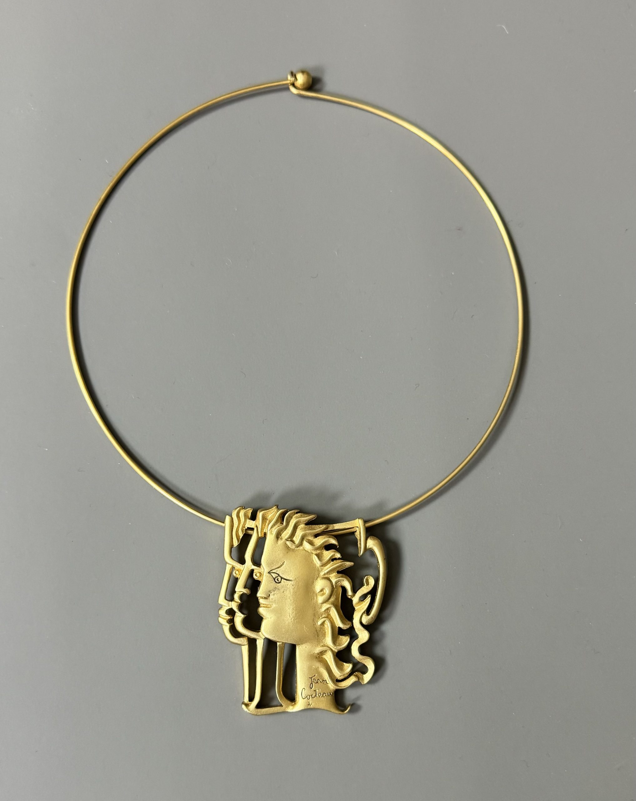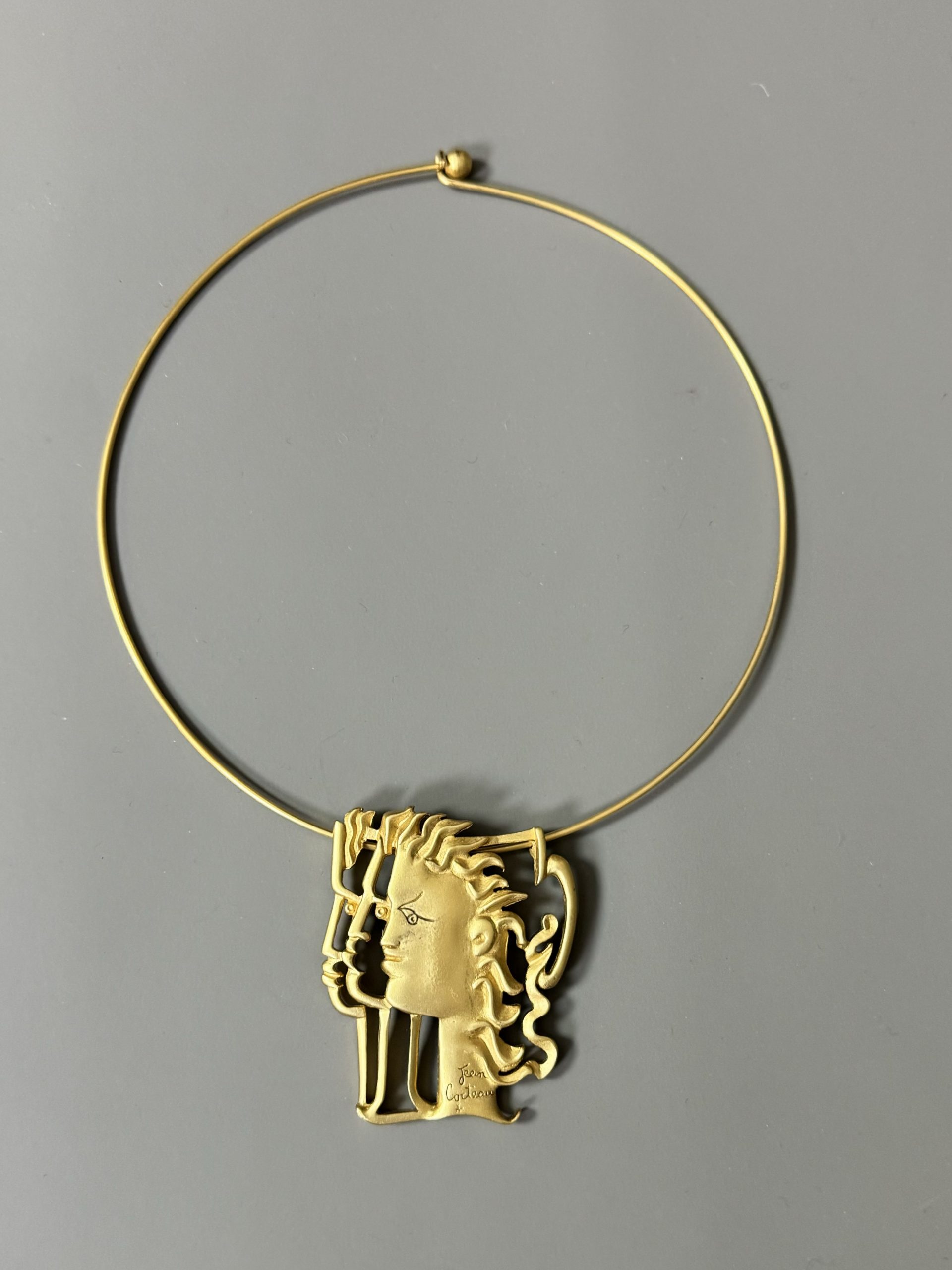 Gold-plated metal pendant necklace, rigid choker. Signed "Jean Cocteau" on the front. Numbered 275/300 on the back.