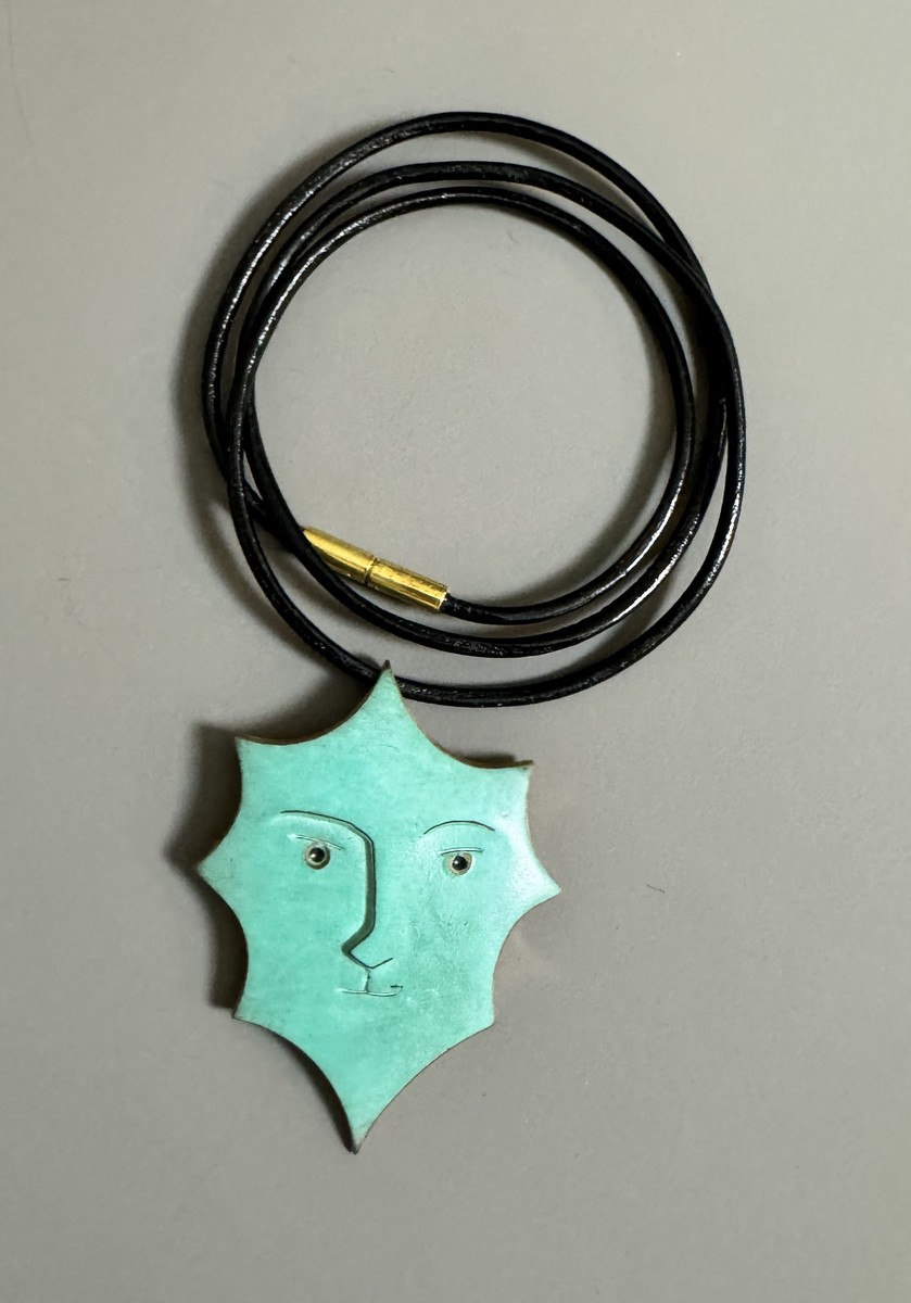 Pendant in polished and celadon patinated bronze, black enamel in the eyes and rolled leather cord.