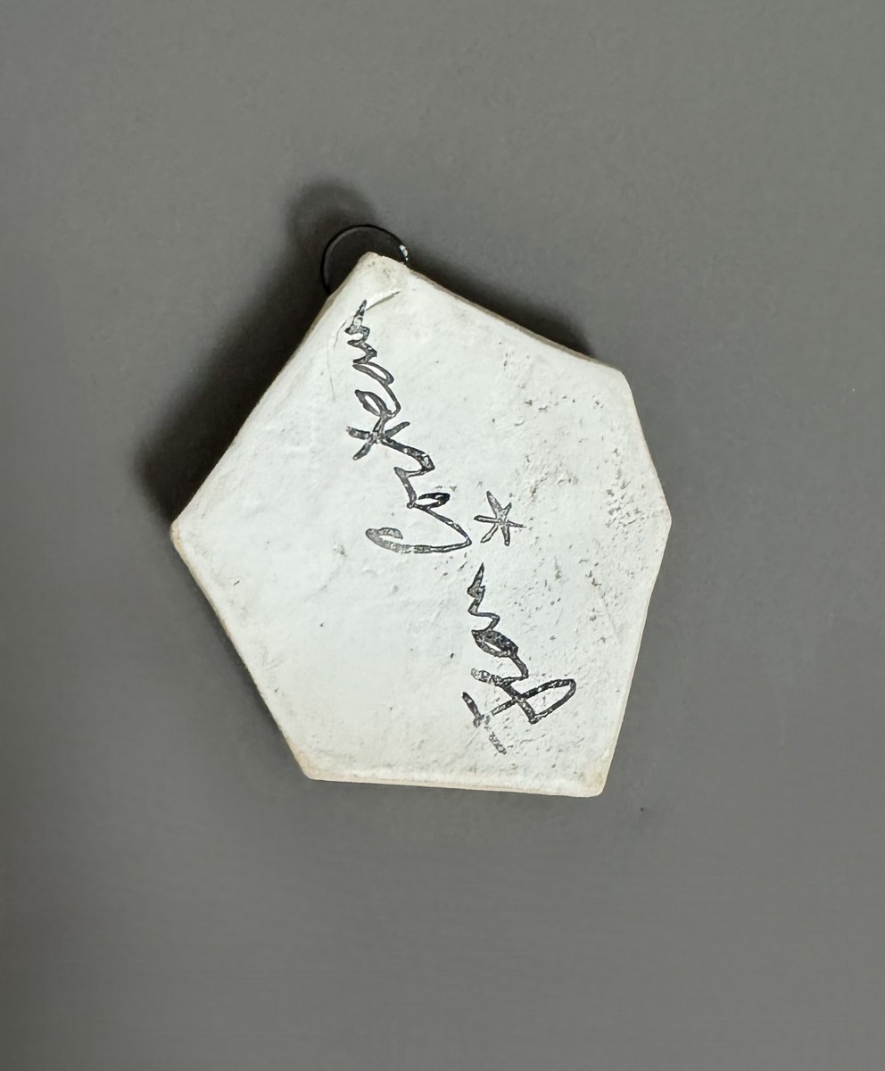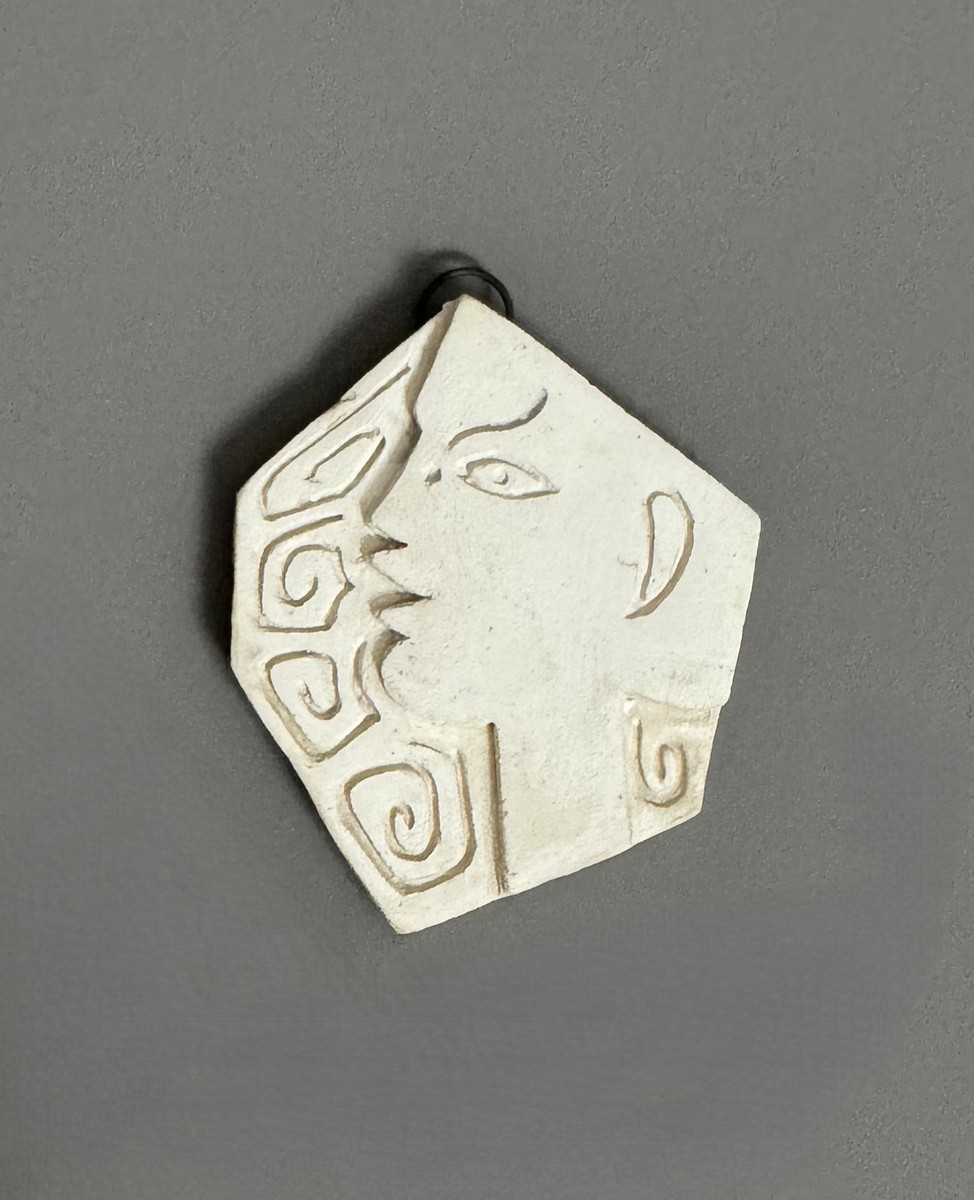 Hexagonal pendant made from a cut-out white earthenware ceramic plaque, depicting a stylized face in relief. Signed "Jean Cocteau" on the back.