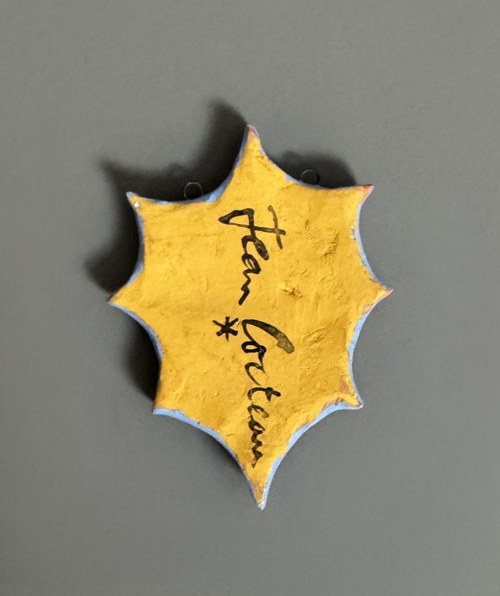 Octagonal pendant made from a cut-out red earthenware ceramic plaque, depicting a stylized blue face. Signed "Jean Cocteau" on the back.