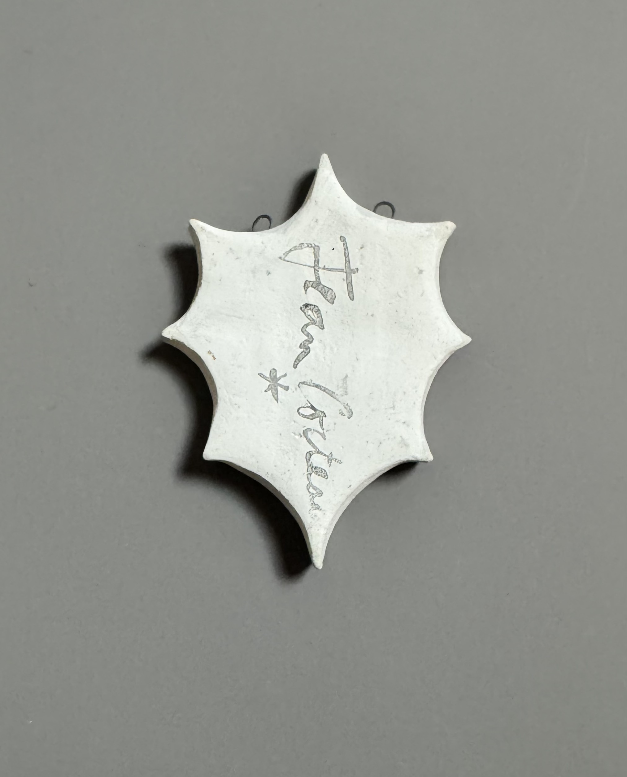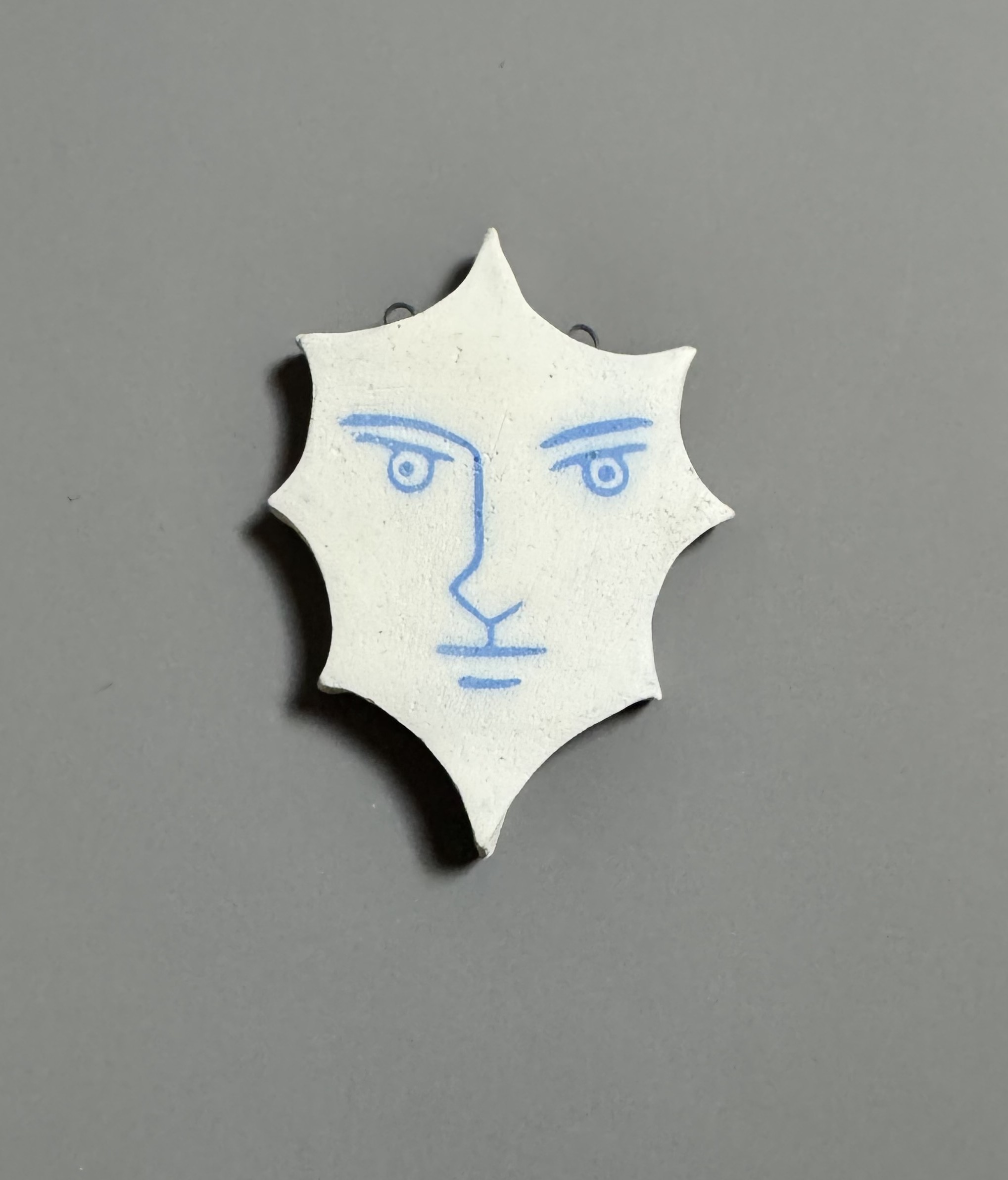 Octagonal pendant made of a cut-out ceramic plate in white and blue engraved earth, depicting a stylized face.