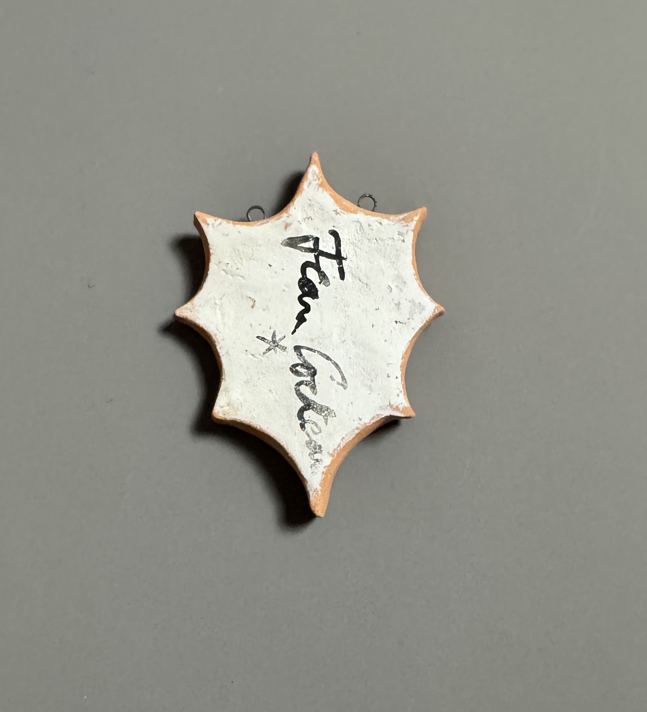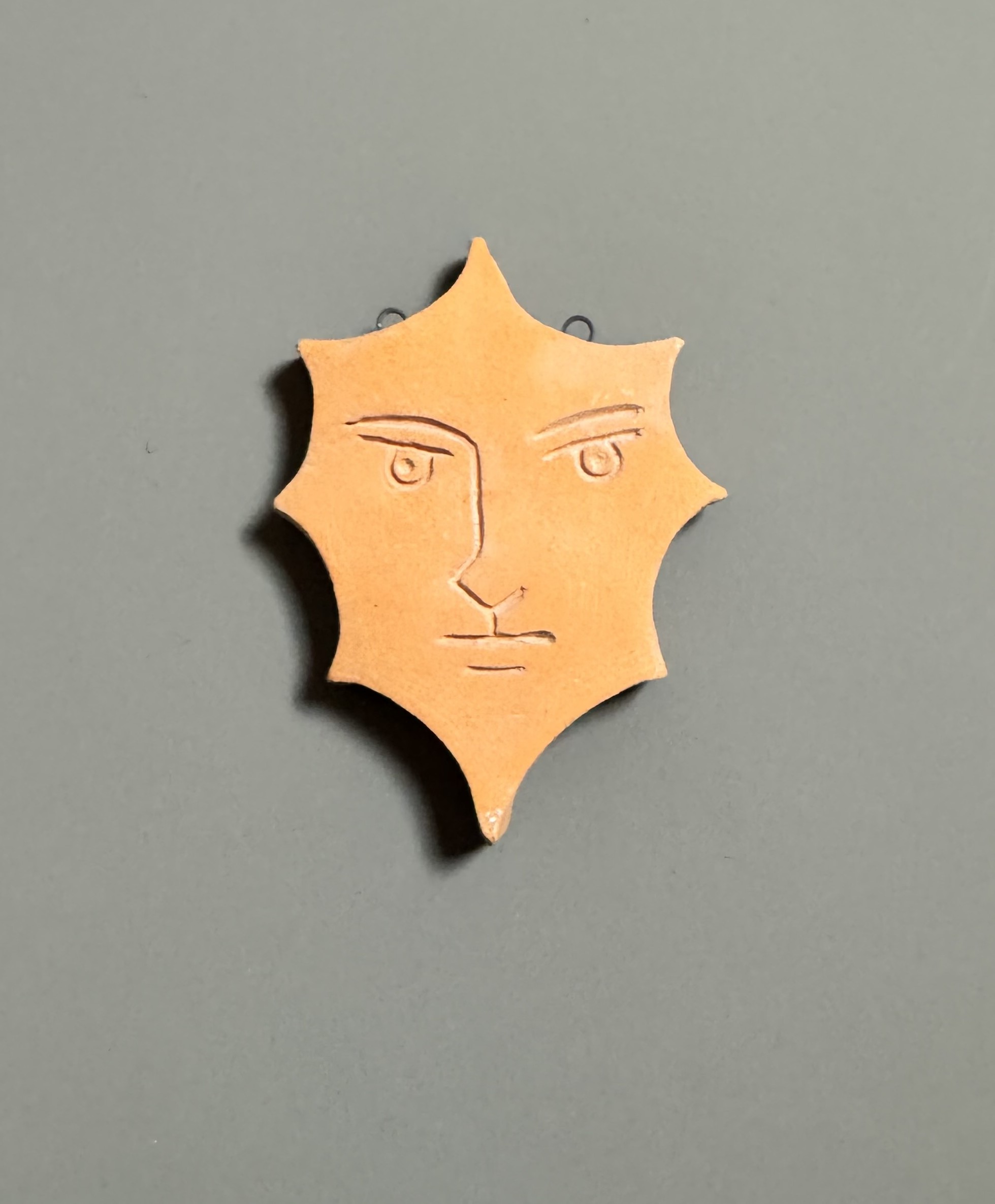 Octagonal pendant made from a cut-out red earthenware plate, featuring a stylized face in relief. Signed 'Jean Cocteau' on the back. Dimensions: 6.8 x 5 cm.