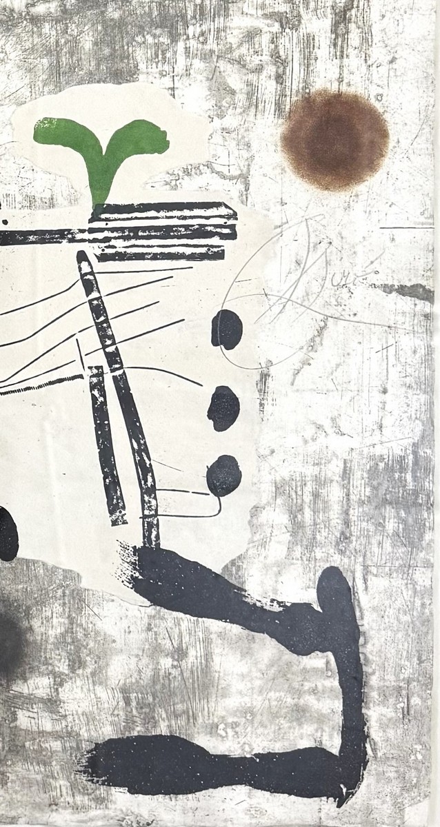 Color etching and aquatint, embossed on Arches wove paper. Signed "Miro". Numbered 28/50 lower left. Published by Maeght Éditeur, Paris. Printed by Joan Barbará, Barcelona, printed on a sheet with deckled edges at the top and bottom, in very good condition.