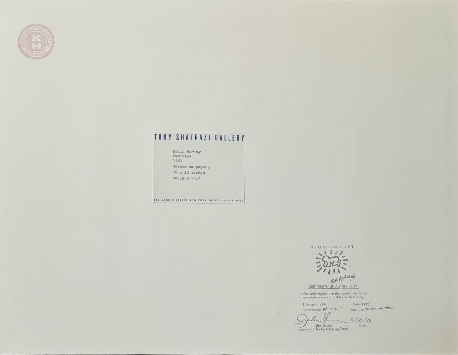 On the back, it bears the stamp 'The Keith Haring Estate' signed Julia Green, the stamp 'Authorized by The Keith Haring Estate', and the Tony Shafrazi Gallery label.