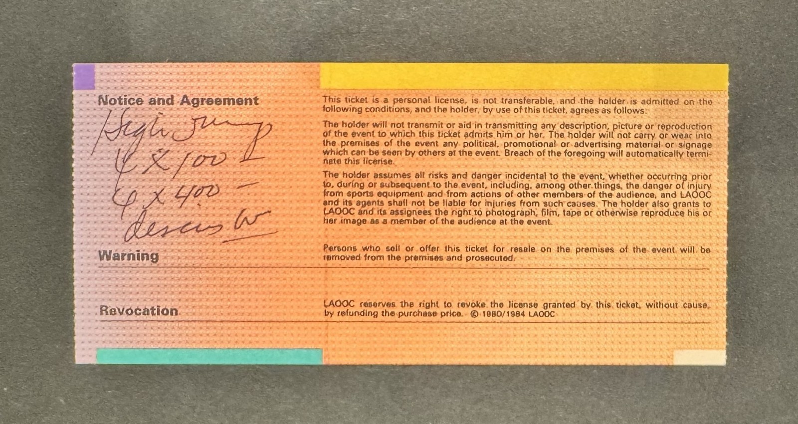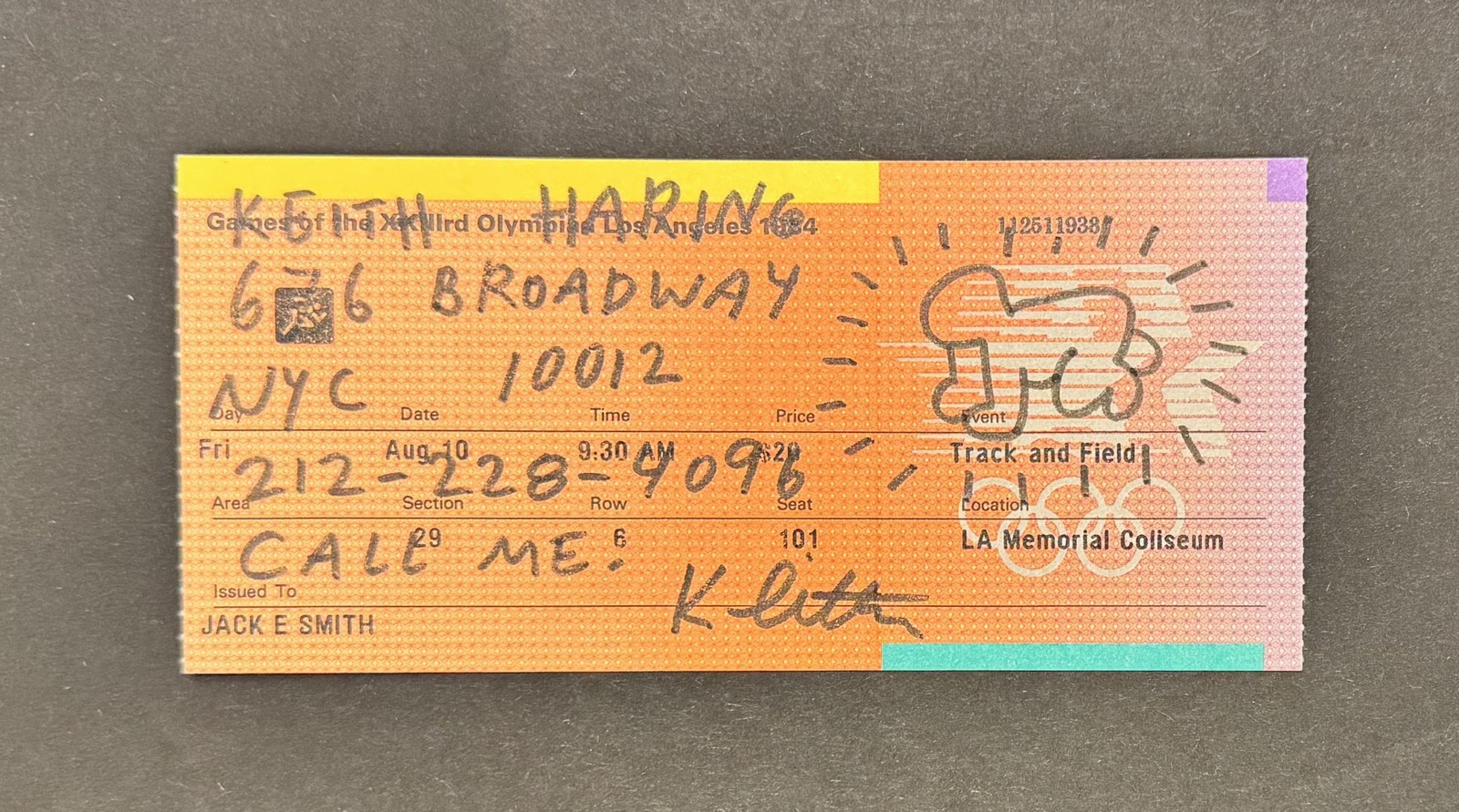 Untitled, 1984. Marker on a ticket for the Games of the XXIIIrd Olympiad Los Angeles at the LA Memorial Coliseum. Bears a drawing and a dedication by the artist. 7 x 15.2 cm.