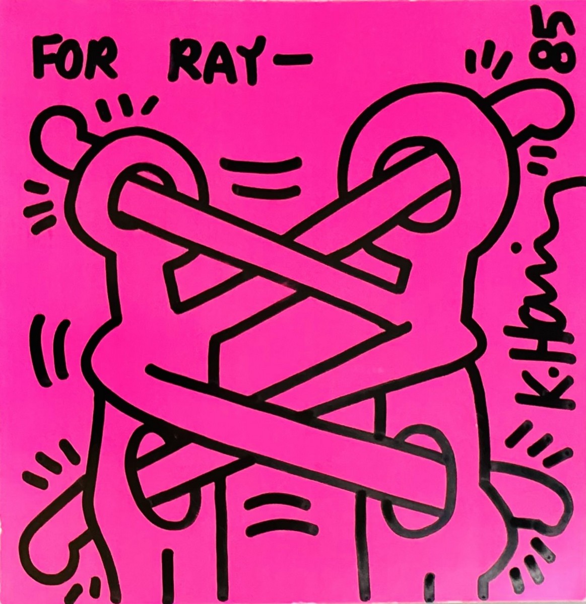 Marker on double-sided pink card, signed and dated 1985. Dedicated 'For Ray' on the reverse.