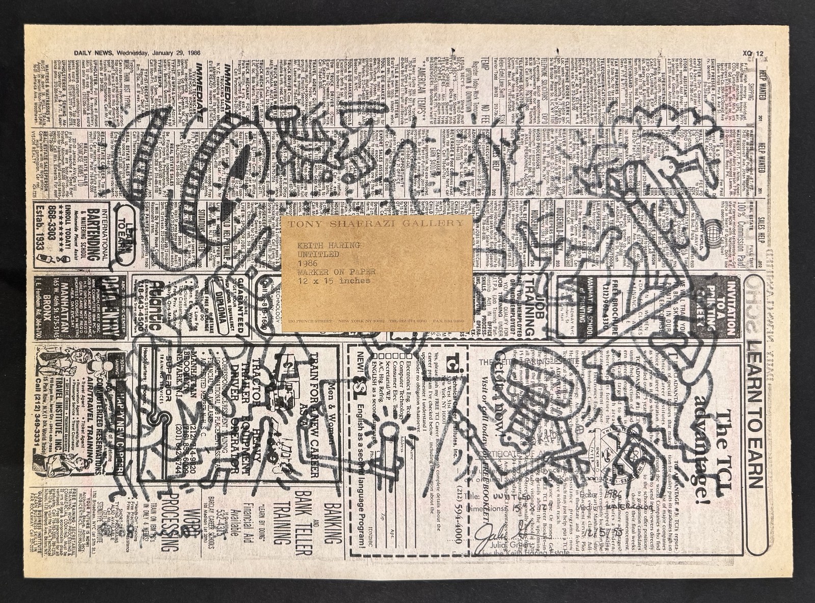 Black and red marker on "Daily News" newspaper dated January 29, 1986, signed and dated. Bears a "Keith Haring Estate, certificate" stamp signed by Julia Green and a Tony Shafrazi Gallery label.