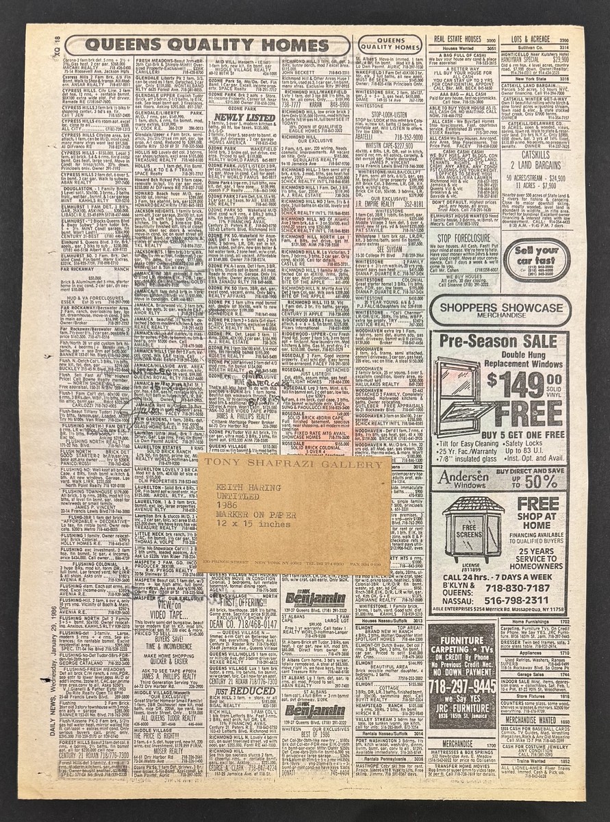 Black marker and watercolor on "Daily News" newspaper dated January 29, 1986, signed and dated. Bears a "Keith Haring Estate, certificate" stamp signed by Julia Green and a Tony Shafrazi Gallery label.