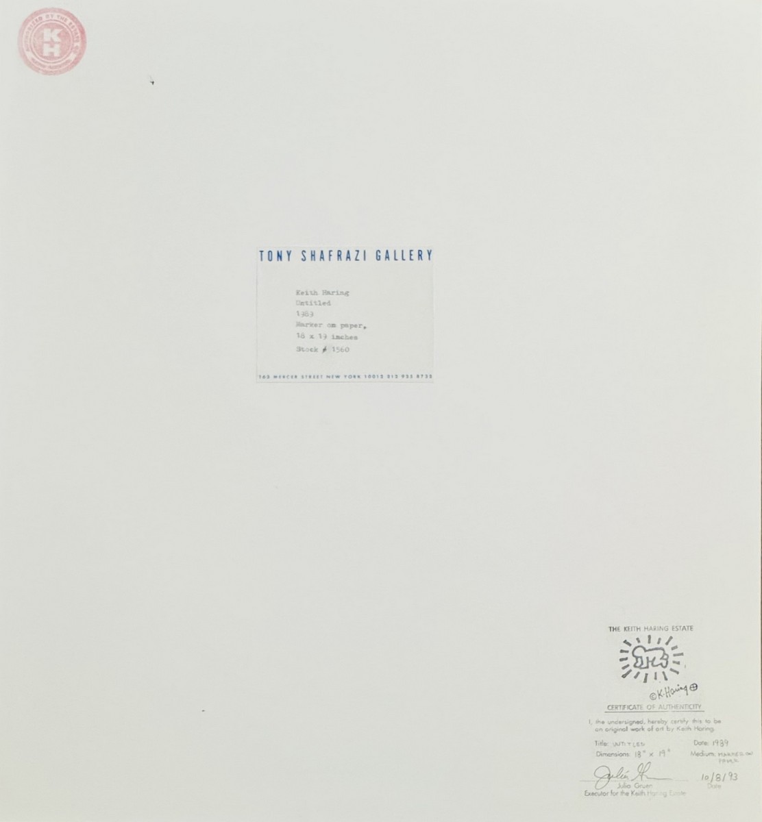On the back, it bears the stamp 'The Keith Haring Estate' signed Julia Green, the stamp 'Authorized by The Keith Haring Estate', and the Tony Shafrazi Gallery label.