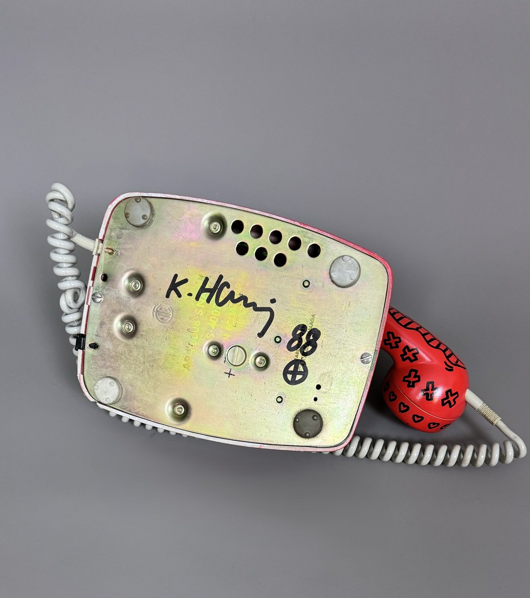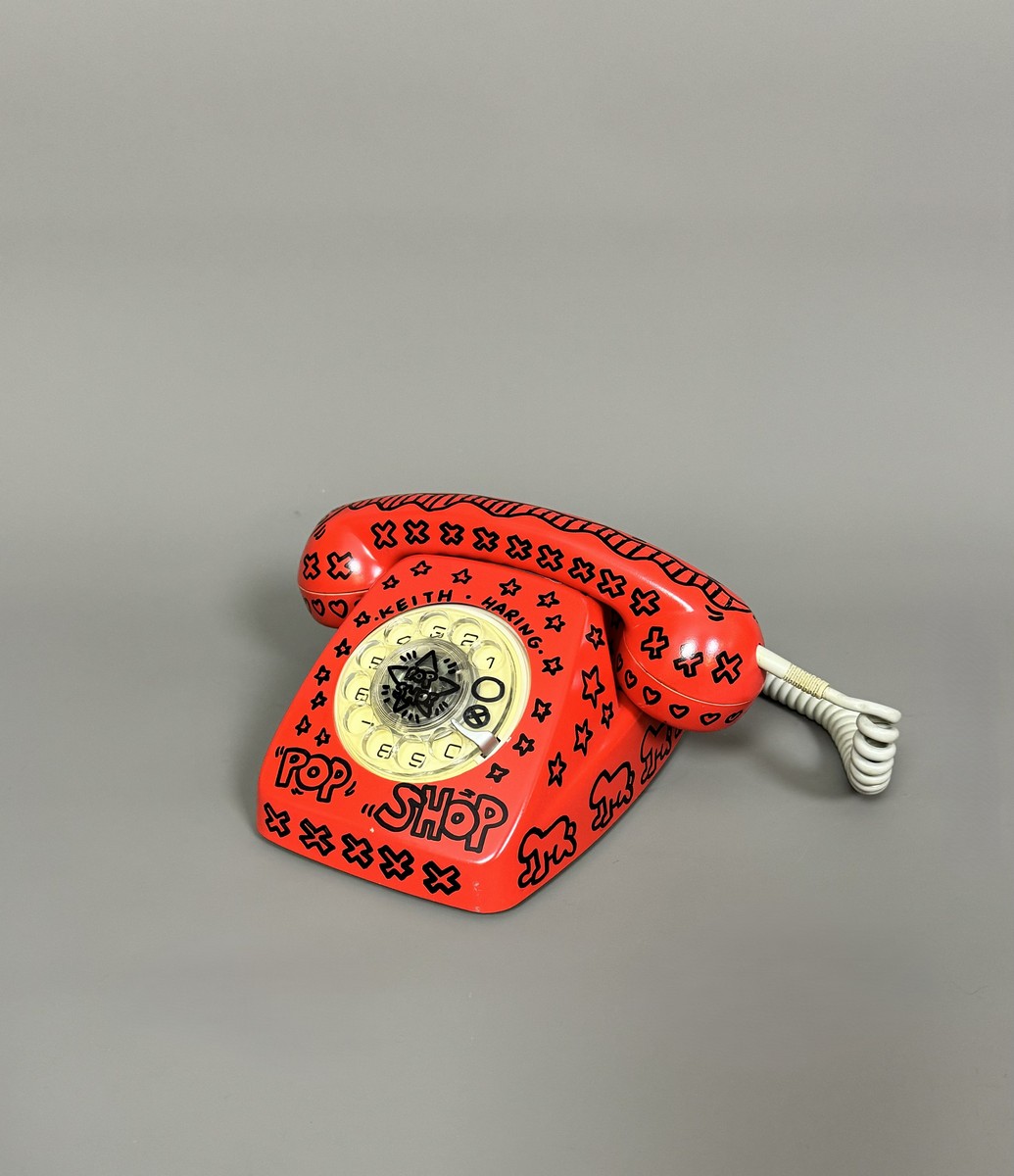 Paint and black marker drawings on metal and plastic rotary dial telephone, fully painted. Signed and dated under the base. Annotated “Pop Shop” and “Keith Haring”.