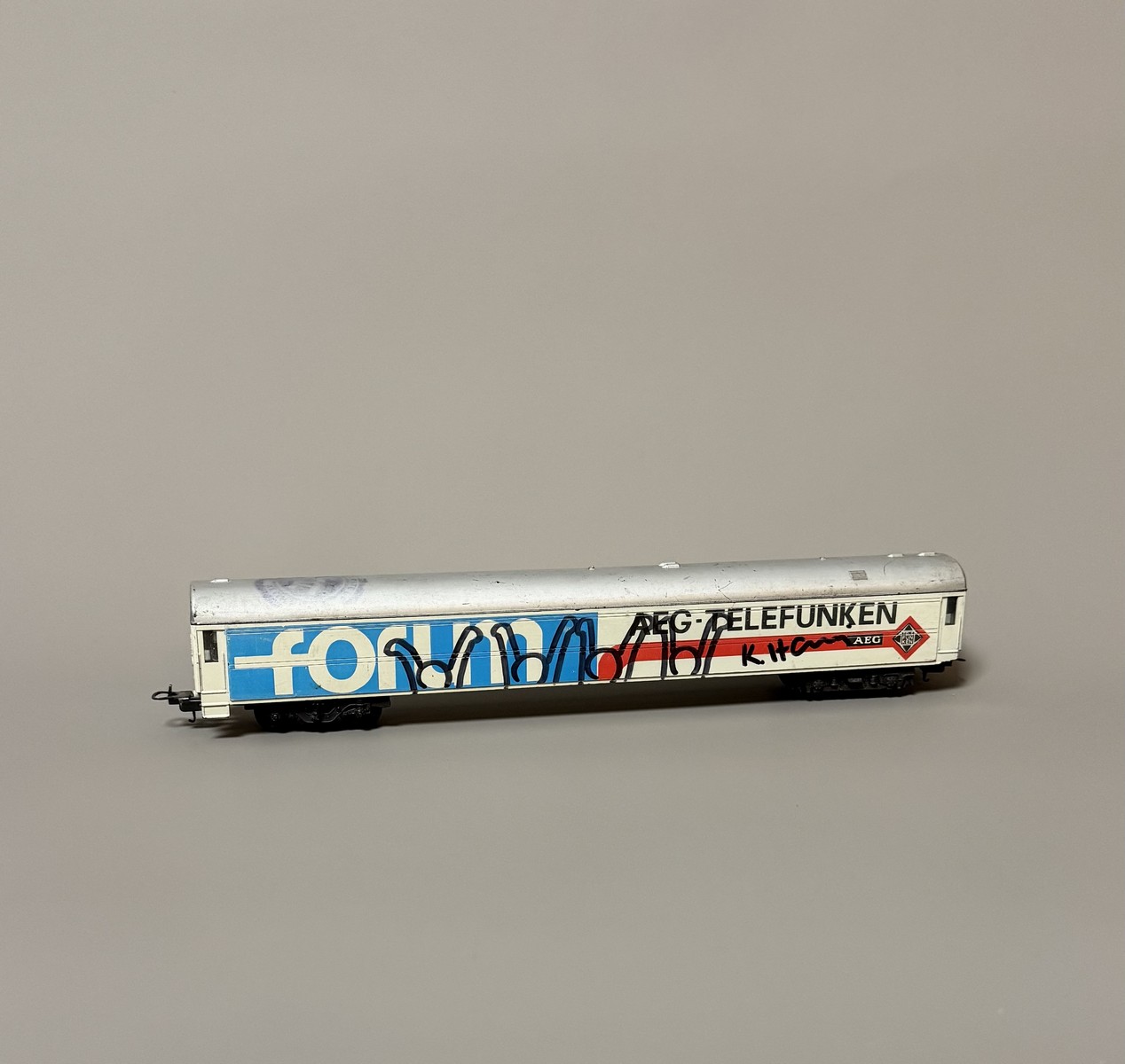 Lot 166 - Keith Haring (1958-1990) , Attributed to. AEG Telefunken miniature train car bearing marker and paint drawings. Signed on both sides.