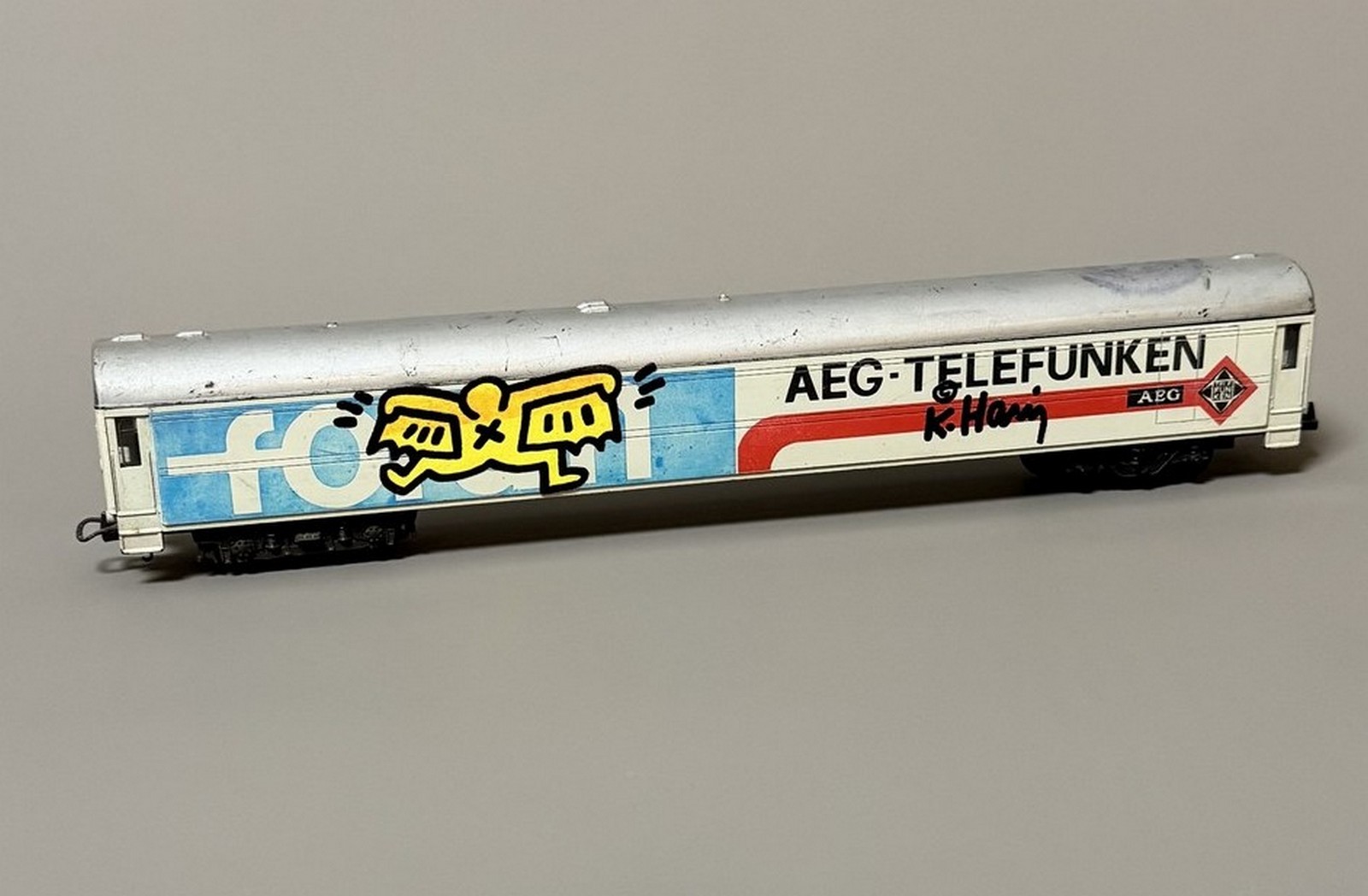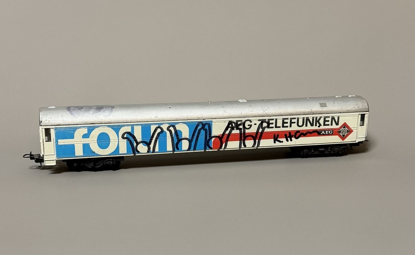 AEG Telefunken miniature train car with marker and paint designs. Signed on both sides.