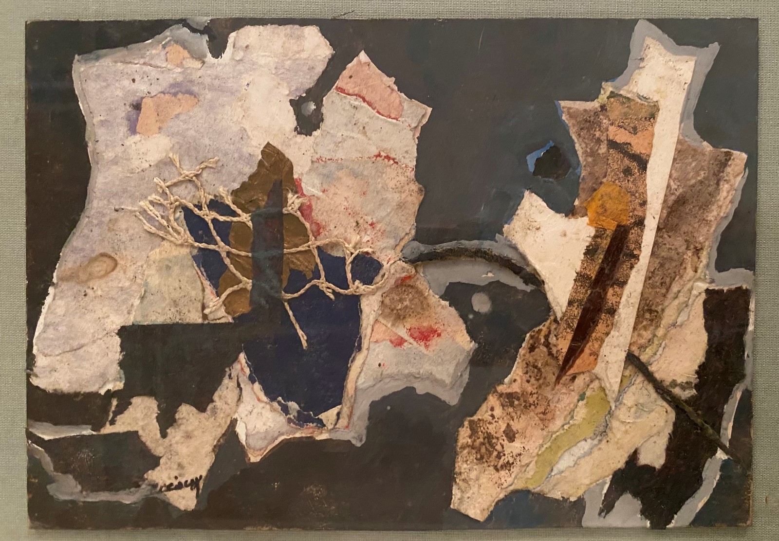 Collage of cut paper and plant fibers on paper, signed lower left