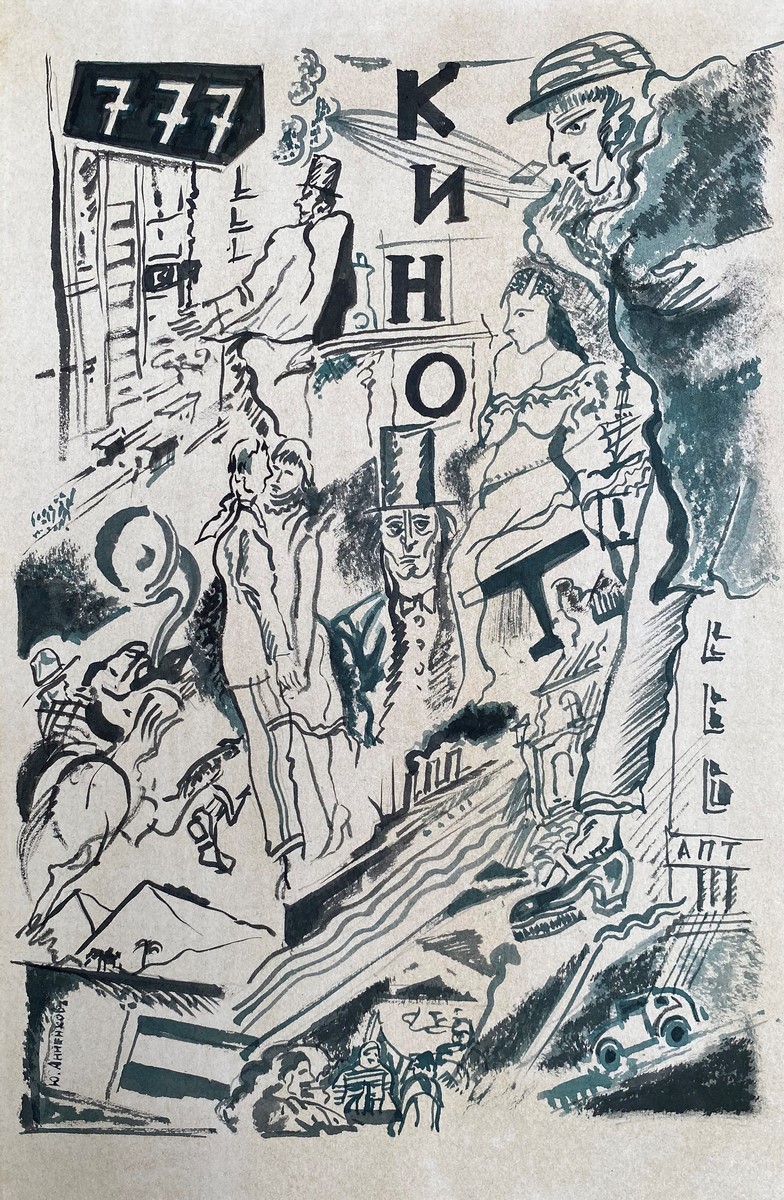 Ink and ink wash on paper, signed lower left, titled Kino in Cyrillic