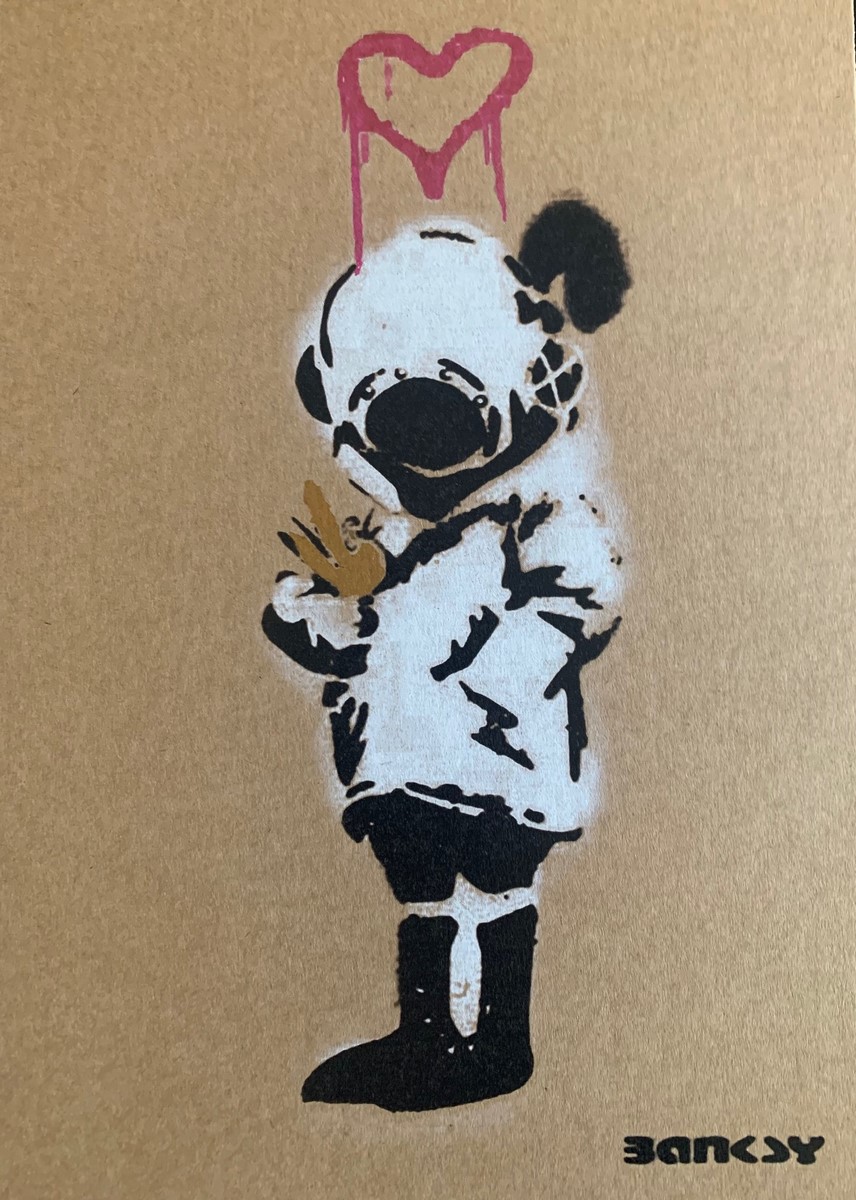 Free stencil spray paint art sown at Banksy's theme park "Dismaland" which ran for two months, from August to September 2015. During the exhibition period, Dismaland held a Free Art where they hid the artwork in various locations and you could take it home with you. (Some damage to the cardboard is the cause.) Comes with original entrance ticket and Dismaland Map.
