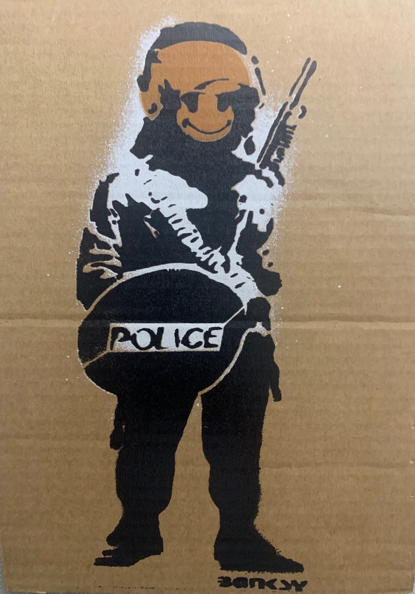 Free stencil spray paint art sown at Banksy's theme park "Dismaland" which ran for two months, from August to September 2015. During the exhibition period, Dismaland held a Free Art where they hid the artwork in various locations and you could take it home with you. (Some damage to the cardboard is the cause.) Comes with original entrance ticket and Dismaland Map.
