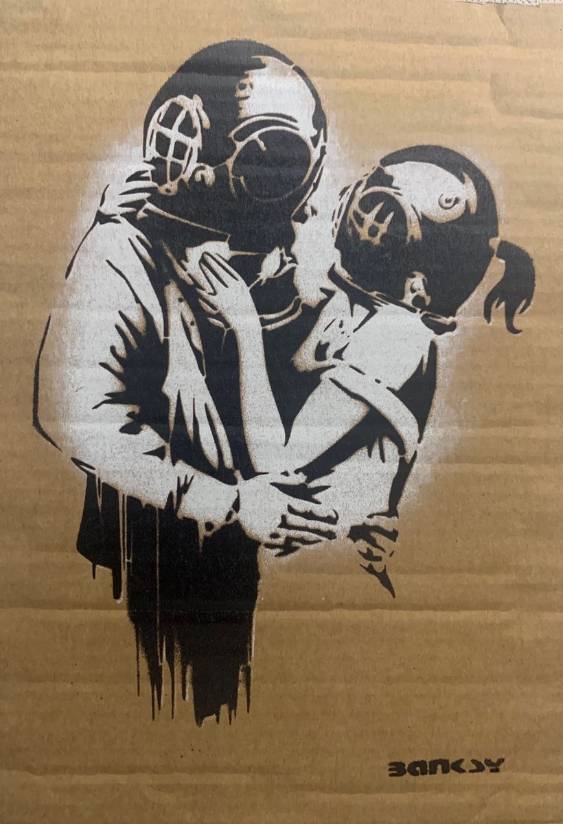 Free stencil spray paint art sown at Banksy's theme park "Dismaland" which ran for two months, from August to September 2015. During the exhibition period, Dismaland held a Free Art where they hid the artwork in various locations and you could take it home with you. (Some damage to the cardboard is the cause.) Comes with original entrance ticket and Dismaland Map.