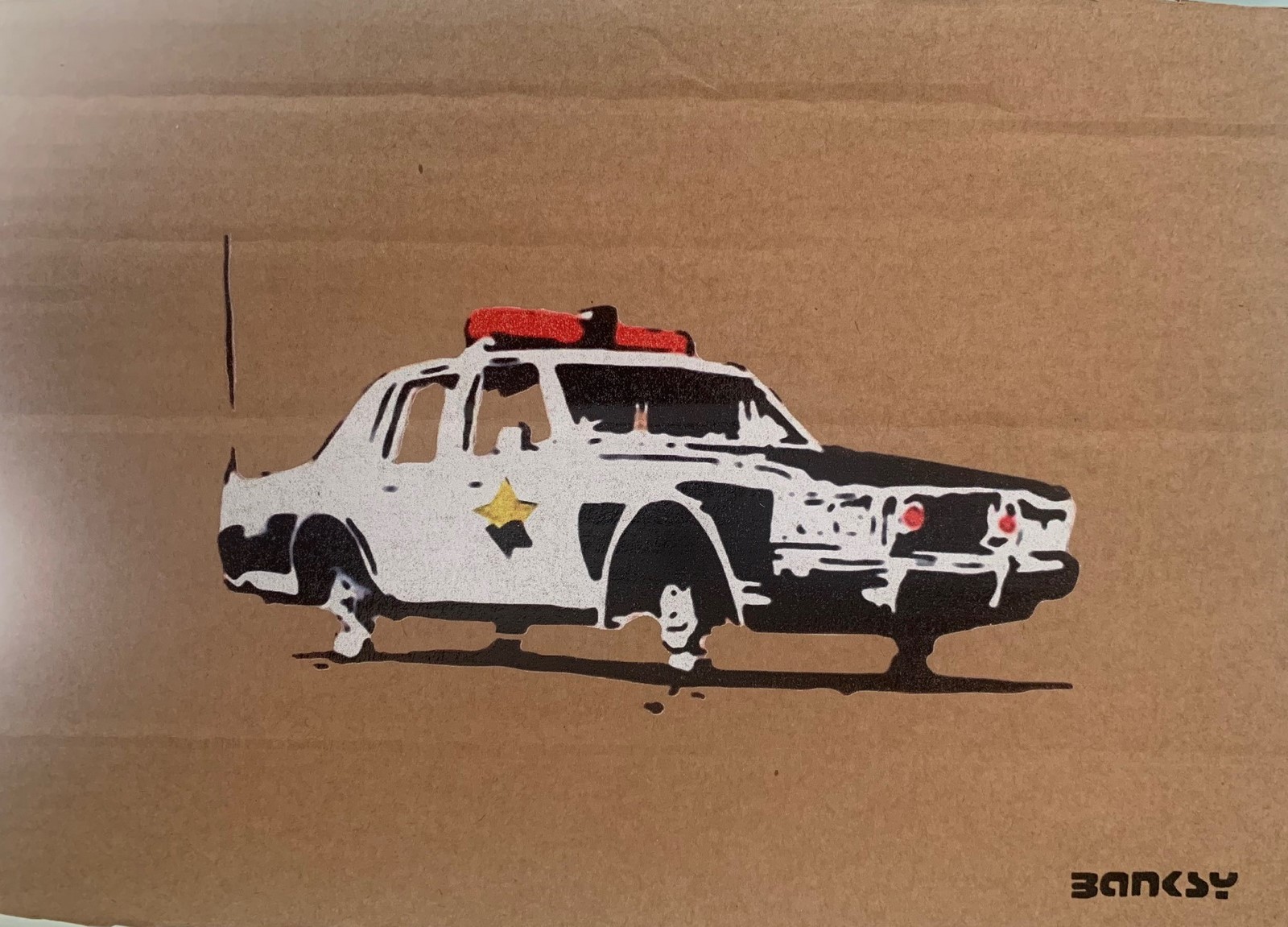 Free stencil spray paint art sown at Banksy's theme park "Dismaland" which ran for two months, from August to September 2015. During the exhibition period, Dismaland held a Free Art where they hid the artwork in various locations and you could take it home with you. (Some damage to the cardboard is the cause.) Comes with original entrance ticket and Dismaland Map.