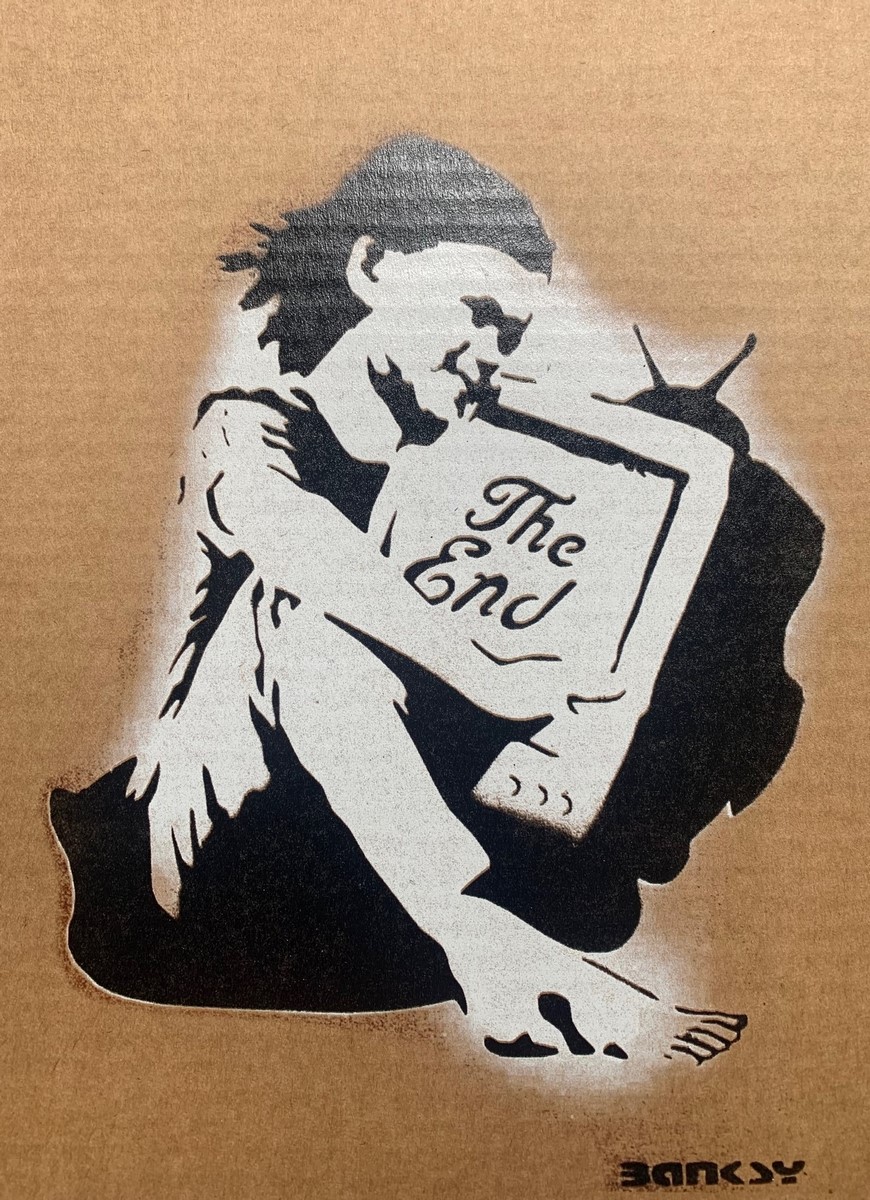 Free stencil spray paint art sown at Banksy's theme park "Dismaland" which ran for two months, from August to September 2015. During the exhibition period, Dismaland held a Free Art where they hid the artwork in various locations and you could take it home with you. (Some damage to the cardboard is the cause.) Comes with original entrance ticket and Dismaland Map.