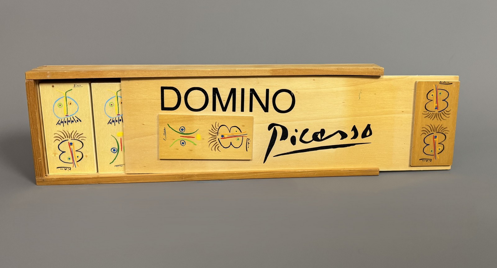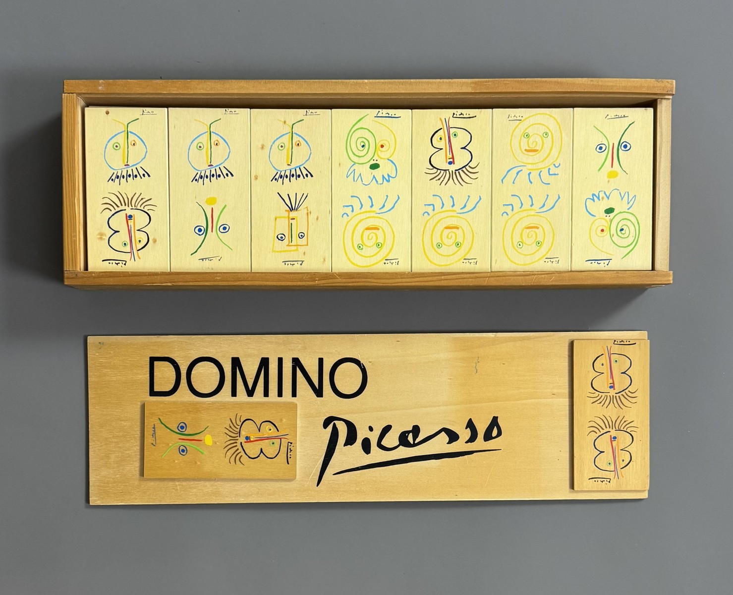 Set of screen-printed wooden dominoes with 7 drawings taken from a series of 32 created by Pablo Picasso in 1960 to illustrate the book by Nobel Prize winner Camilo José Cela, entitled «Gavilla de Fábulas sin Amor», Limited Edition of 2,135 copies. Las ediciones de los papeles de Son Armadans, Palma de Mallorca.