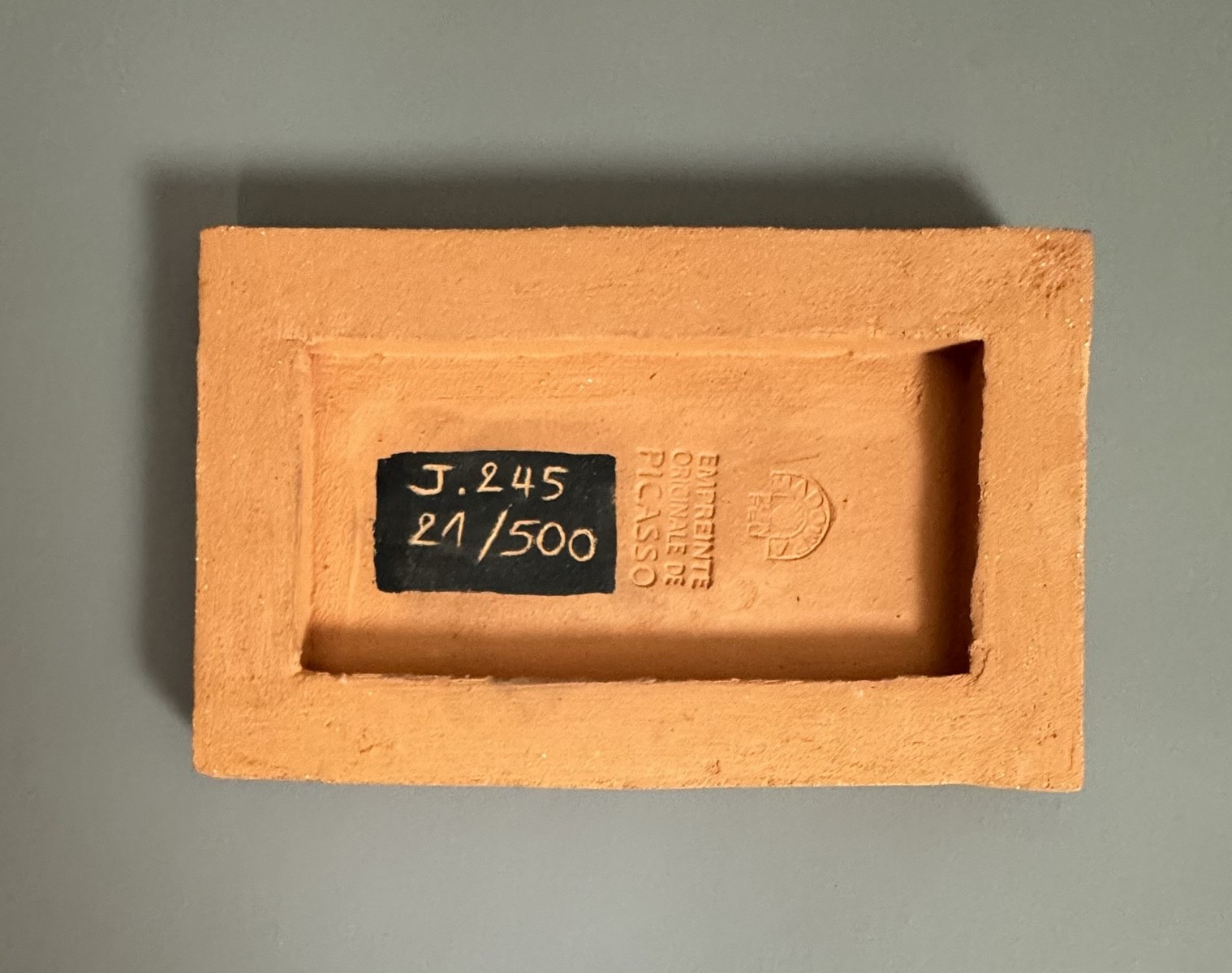 Terracotta plaque with stamped black slip, marked and numbered "Madoura Plein Feu / Empreinte Originale de Picasso / J. 245 / 21/200" (on the reverse).