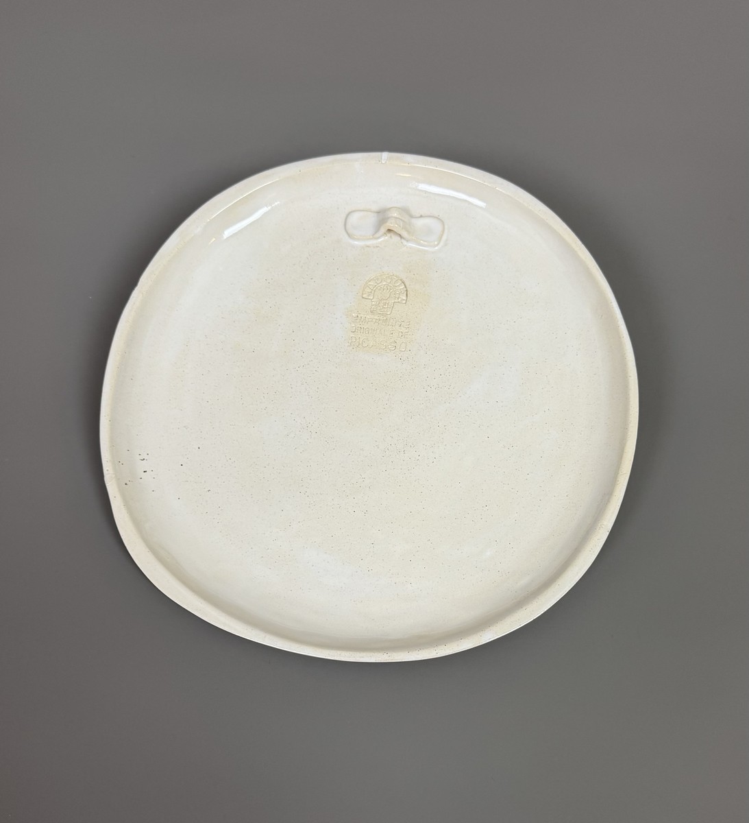 Convex wall plaque. White earthenware, engraving highlighted with oxidized paraffin, glazed, decorated in ivory and brown. Edition of 450. Incised stamps “Madoura Plein Feu” and “Empreinte originale Picasso” underneath.