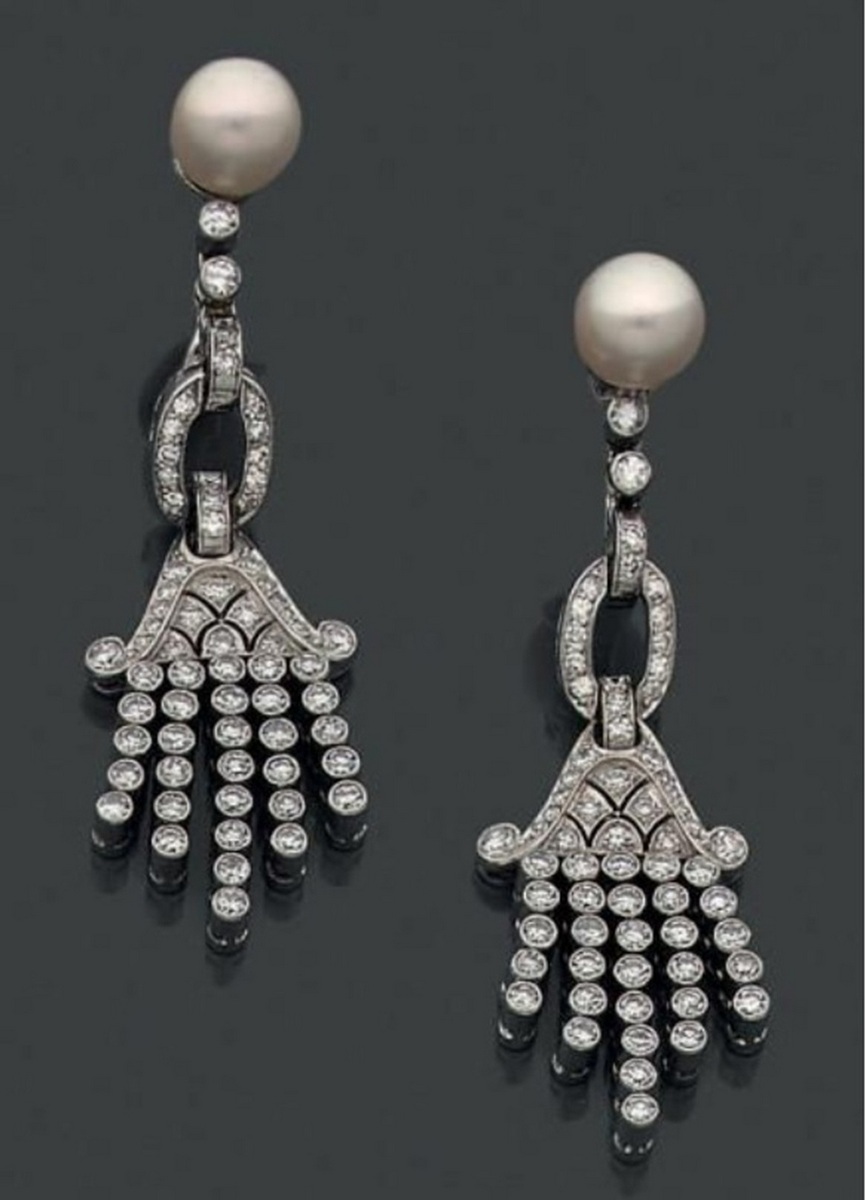 PAIR OF EARRINGS in 18K (750°/00) white gold adorned with cultured pearls, decorated with tassels set with 8/8-cut diamonds. Total gross weight: 26 g.