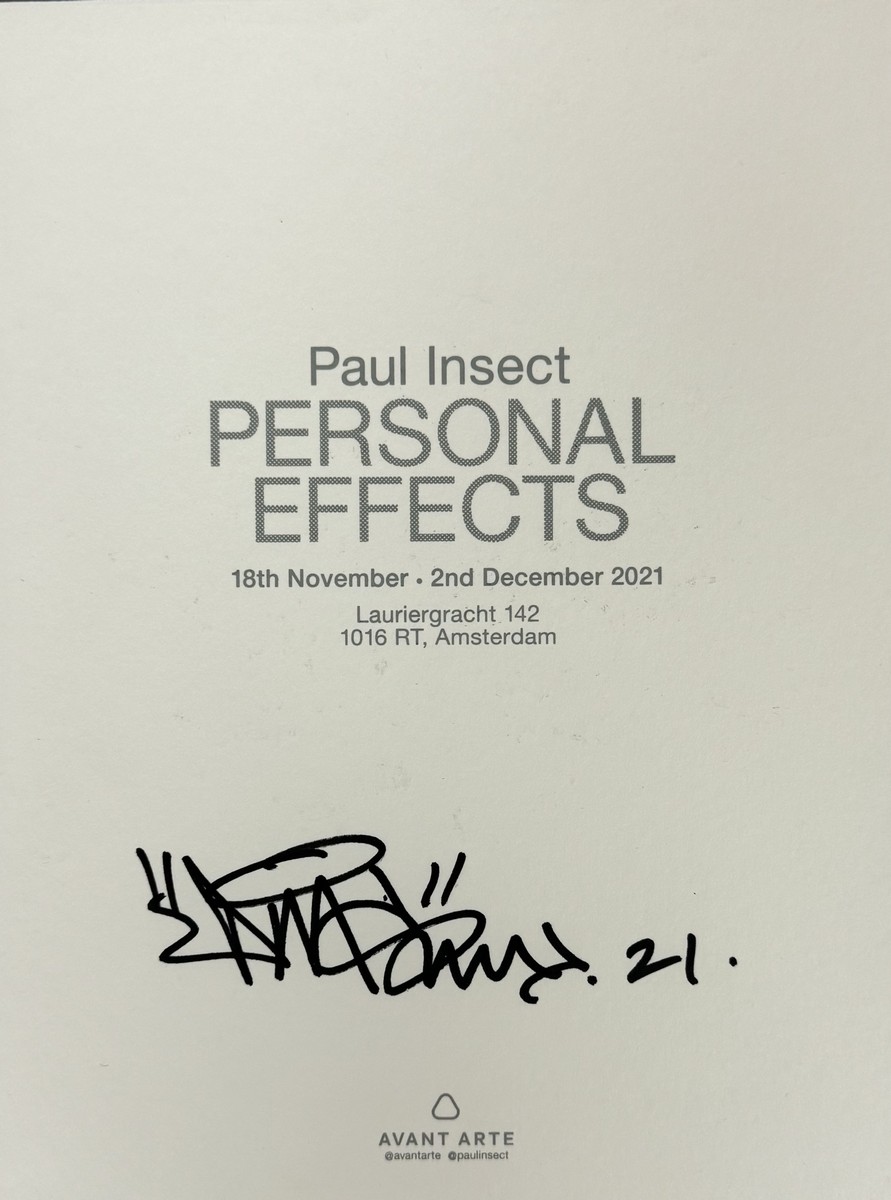 Dedication on the invitation card for the exhibition Personal Effects, 18th Nov. – 2nd Dec. 2021, Avant Arte Gallery. Amsterdam. Ed. Avant Arte.